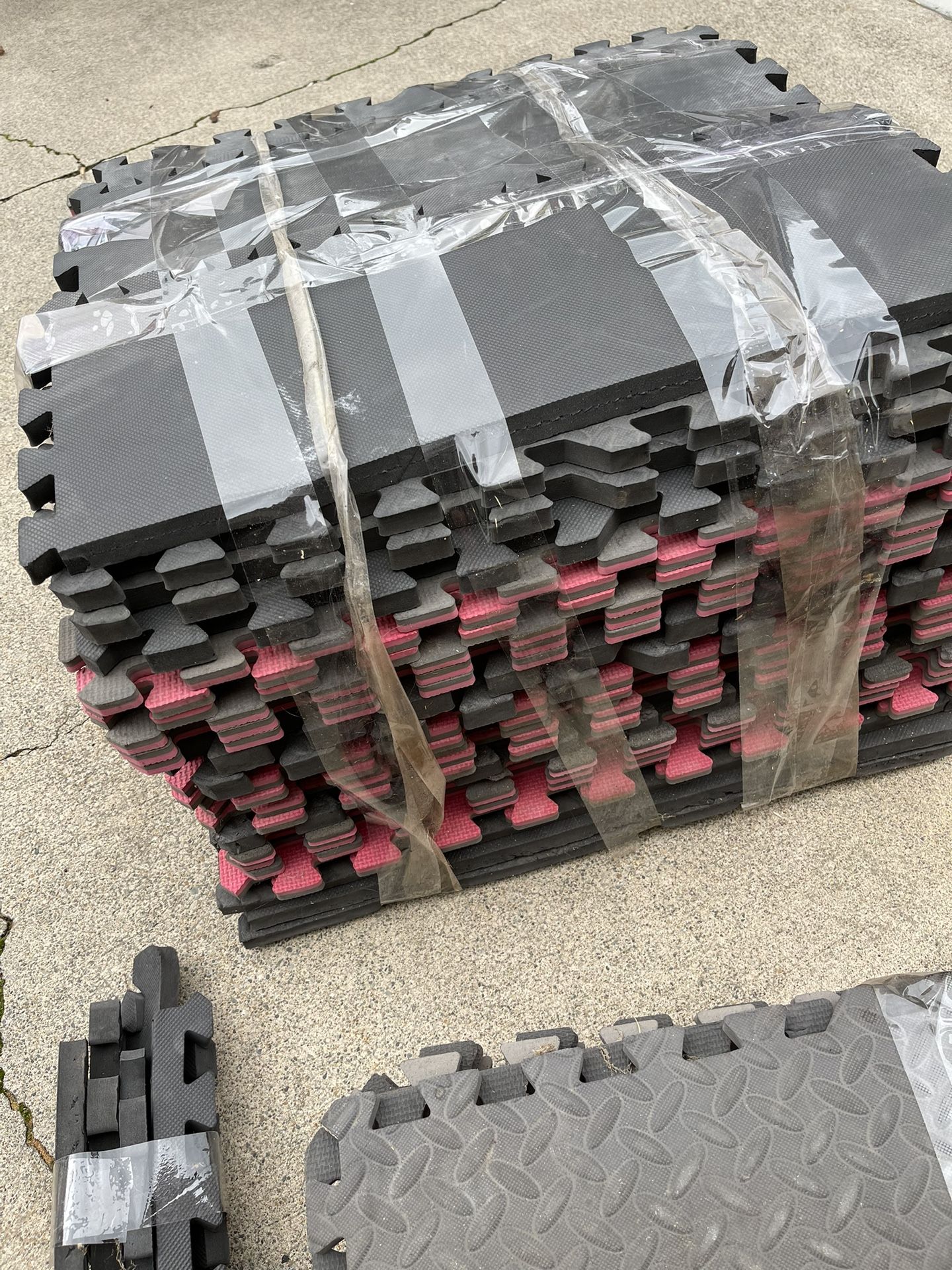 24”x24” interlocking mats. 2 thicknesses 3/4” and 1/2”. Can be used in garage, basement, workout room or home.