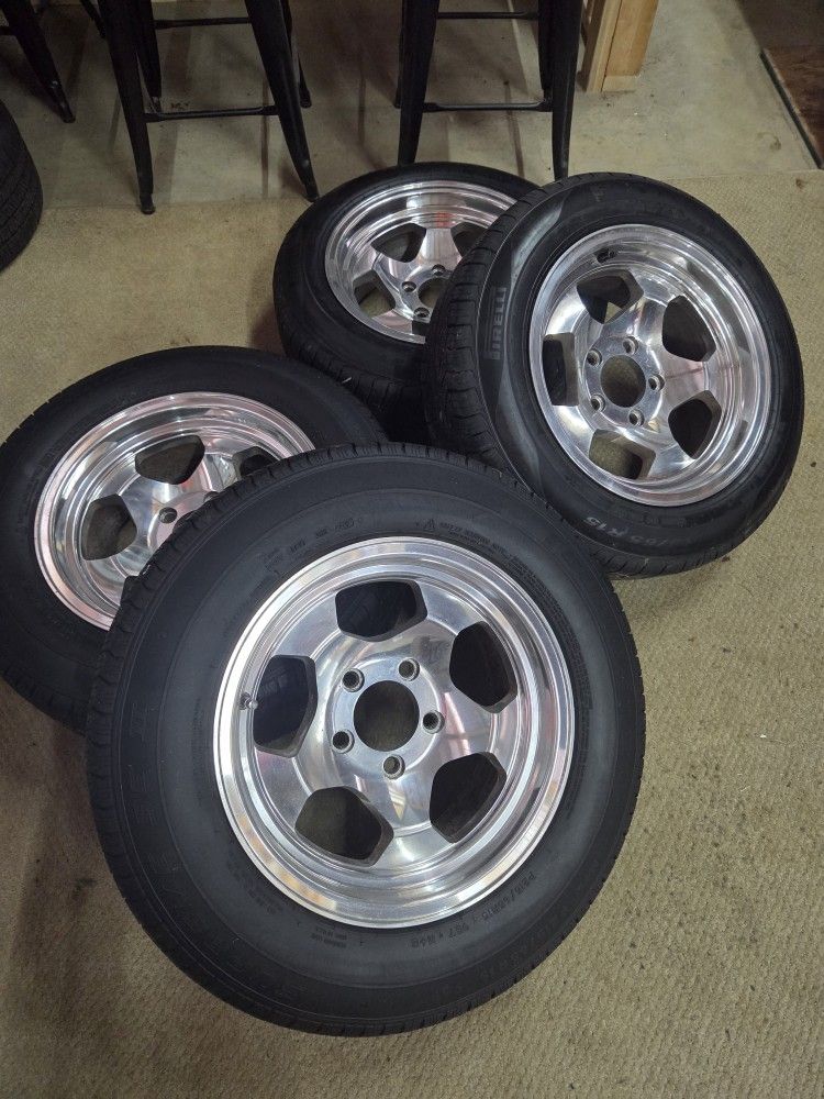 Have a nice set of wheels for sale with center caps. They are 15x7 with 5 on 4 3/4 bolt pattern. Came off my 79 El Camino. Rear tires 75-85 tread. Fronts and new. Just decided on a different look. Lugs not included.