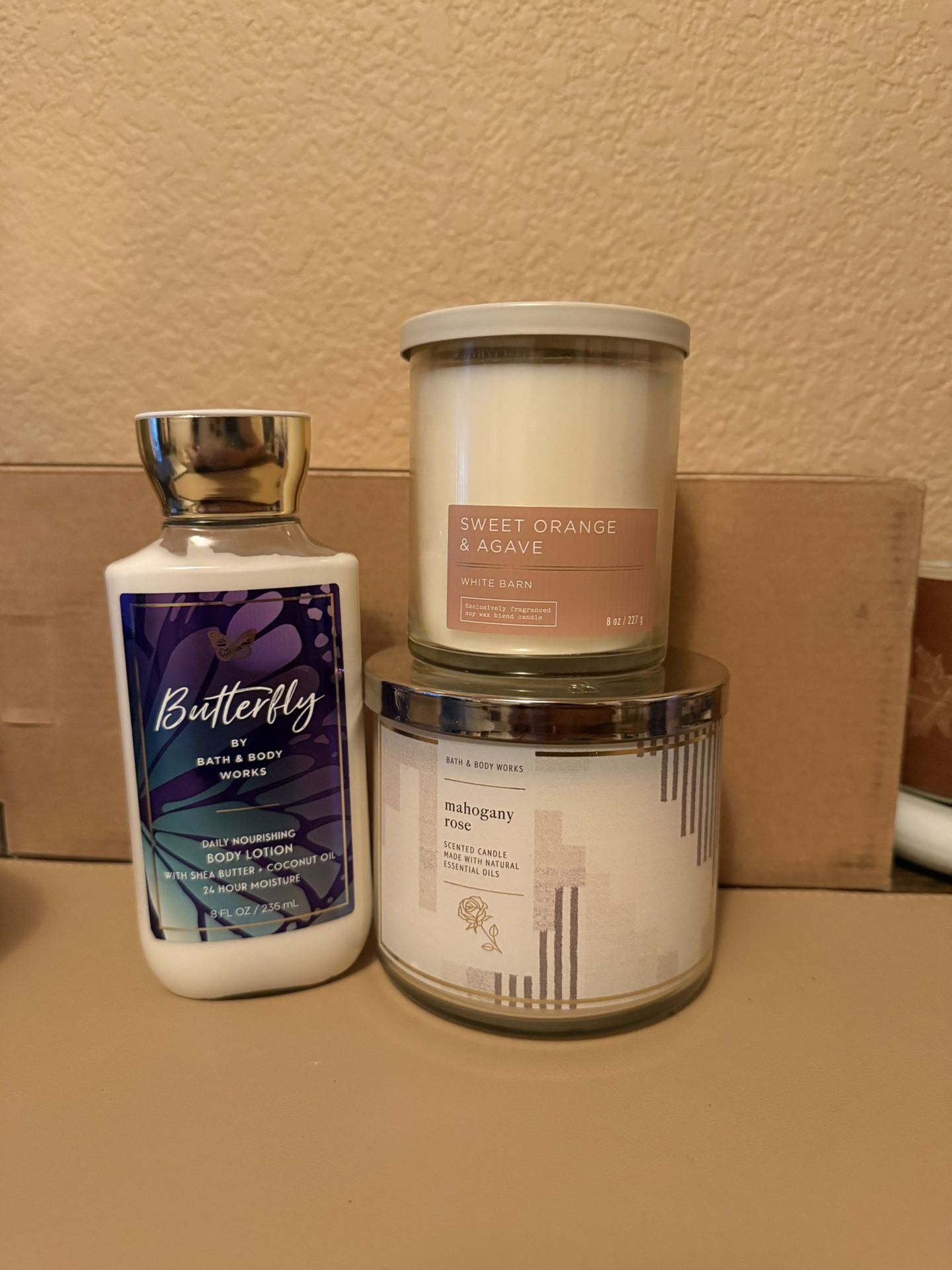 Bath and body bundle Butterfly body lotion Mahogany rose three wick candle Sweet orange & agave single wick candle