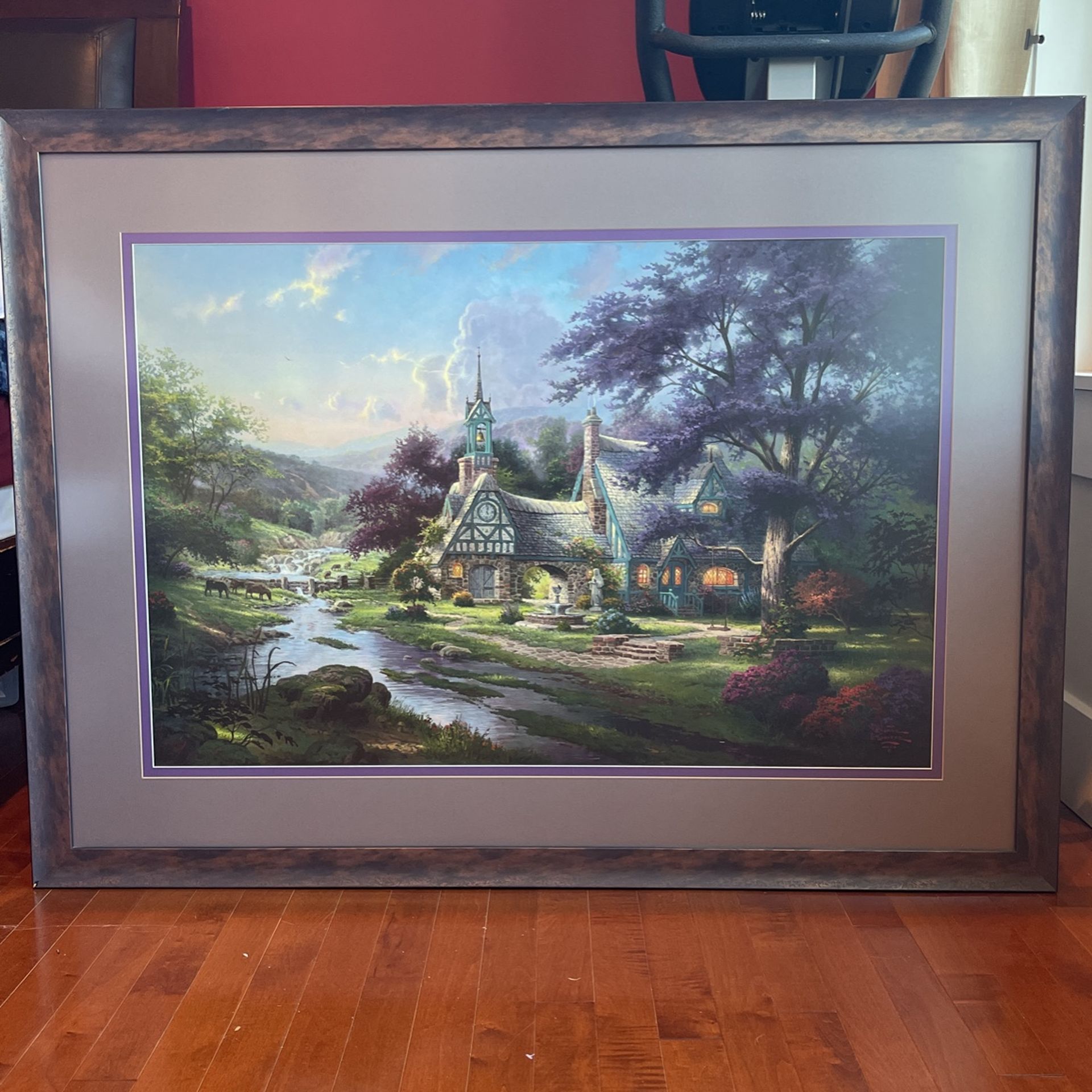 Beautiful, large, signed picture of the Clocktower Cottage by Thomas Kinkade, the “Painter of Light.” The picture itself is 24”x 36” (2’ x 3’) With the frame & matting it is 35” x 47” (2” short of 3’ x 4’) Bought online at an estate sale auction - didn’t realize the authenticity paper was missing. With it being signed, however, that was not the problem. Unfortunately for me, the matting colors do not match any rooms in my house. I’m hoping someone can be blessed by this picture