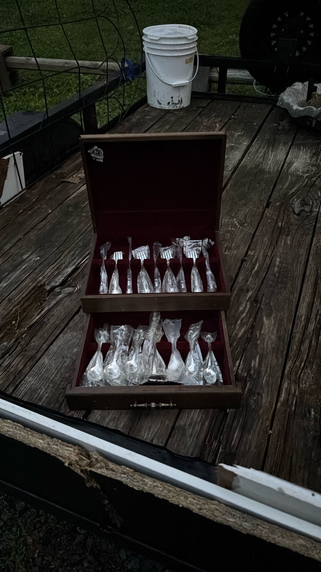 My grandfather left this to me. I’m not interested in. It doesn’t match my set looking it’s like a nice I don’t know 48 piece or 58 piece or some weird number silverware set spoons for some other type of fork. Some other type of spoon Leto and butter knives silver in color I don’t know in a wood chest.