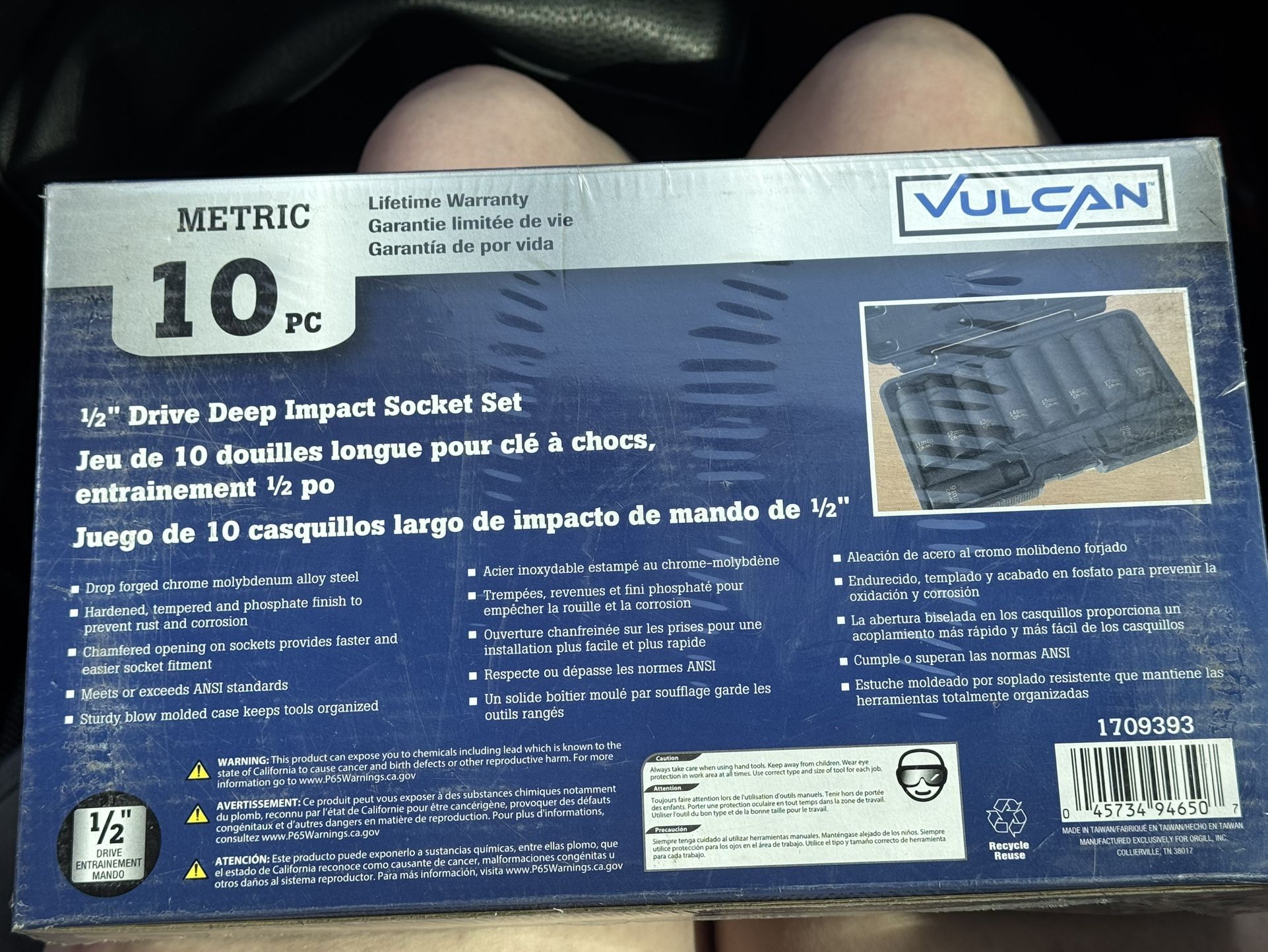 Brand new. Vulcan MTI10-M Socket Set, Chrome Molybdenum Steel, Tempered Phosphate 1/2" drive deep impact socket set 10pc metric