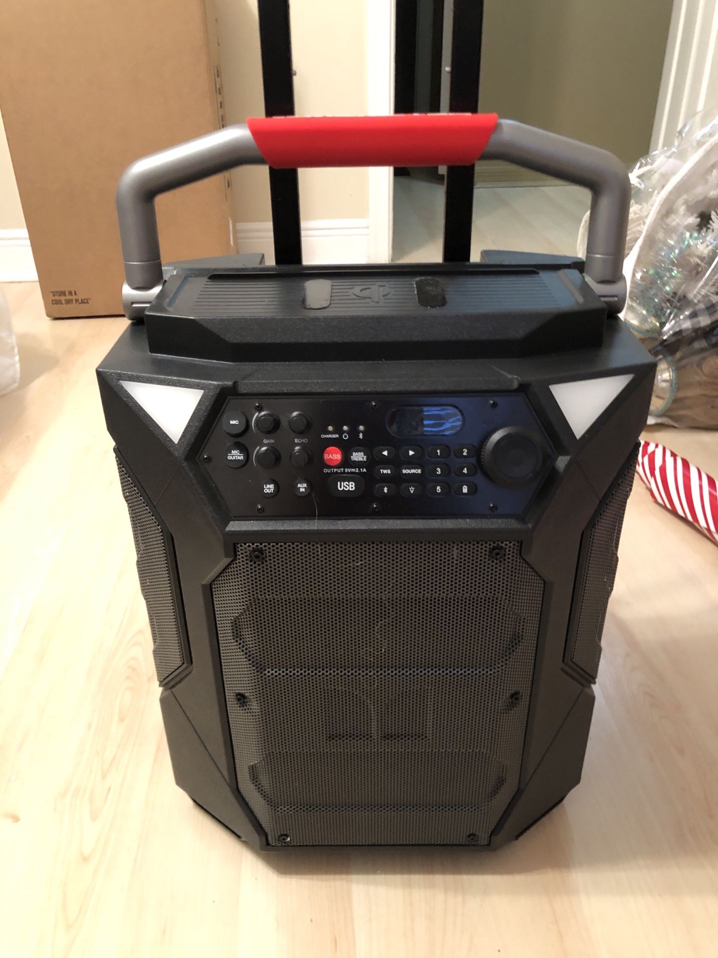 Monster Rockin'Roller 270X The latest installment of the popular Monster Rockin' Rollers, the 270 is an audio heavyweight with new 270-degree sound, plus up to 200 watts and up to 100 hours of playtime. The rigid design ensures the Rockin' Roller 270 performs, whether onstage or at the tailgate. If you have an urge to crank up the bass, press the easily found BASS button. The front panel on this Monster Rockin’ Roller 270 Bluetooth speaker lets you control the EQ settings, radio, and mic levels. Specifications: NEW Monster Live DJ APP 270 degree sound (Front, Left and Right) Up to 100 hours of playtime Built-in Qi Wireless Charger TWS (True Wireless) Connect 2 speakers Up to 200 Watts (when plugged in), 120 Watts (battery power) IPX4 Water-Resistant Telescoping Handle for ease of transportation Oversized Wheels to help with rough terrain Adjustable top handle to allow for phone and tablet stand Includes wired mic LED Light . 270 degree sound (Front, Left, and Right) Up to 200 Watts (when plugged in), 120 Watts (battery power) Wirelessly charge your devices with the built-in Qi Charger Water-resistant exterior makes it perfect for outdoors New Monster Live DJ APP and bottle opener Bluetooth connectivity for wireless audio streaming Lightly Used… perfect condition Microphone included