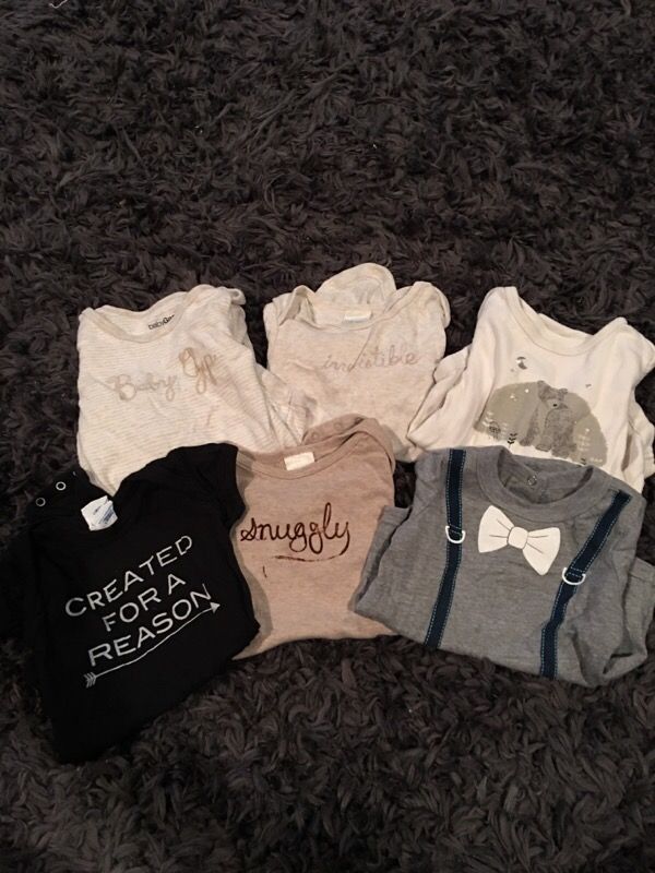 Super cute onesies for gender neutral ! Sizes: baby Gap-6-12 months irresistible- 3-6 months Moon Bear- 6-12 months created for a reason - 6 months snuggle- 3-6 months Bow tie suspenders- 3-6 months Can sell individually or $15 for all