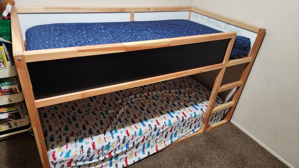 Ikea kids bed that can be made for a single bottom or a single top bed with empty play area under Or what we did was put a mattress and have it as a "bunk bed" that worked while both were toddlers. Orginal price $300 as in photos for just the frame, it was Taken care of and used for a short period before we moved. All taken apart and packed up as shown in last photos. NO MATTESSES OR BEDDING IS INCLUDED OR CAME WITH THE BED FRAME (sorry for the caps but every Facebook question was asking about the mattresses, I purchased those from Casper) Pick up 90220 or can deliver to surrounding areas for a fee* Cash or zelle/venmo/cash app accepted