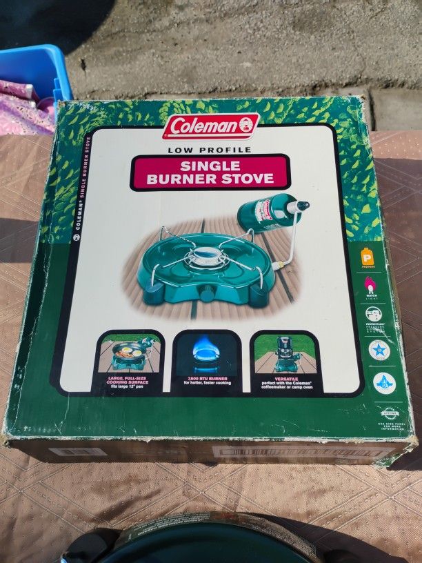Coleman Low Profile Single Burner Stove (New Open Box) 7500 BTU BURNER LARGE FULL-SIZE COOKING SURFACE fits 12 inch pan Propane, match light, Perfectionflow