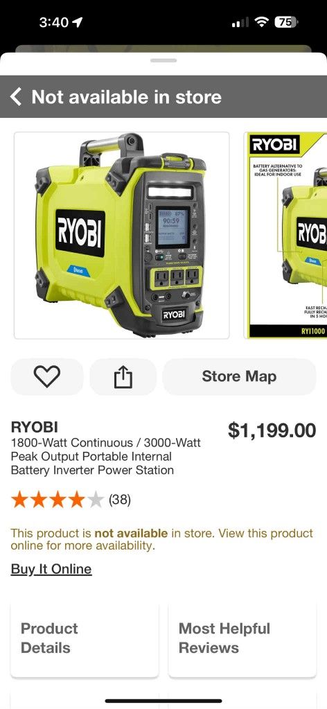 RYOBI 1800-Watt Continuous / 3000-Watt Peak Output Portable Internal Battery Inverter Power Station