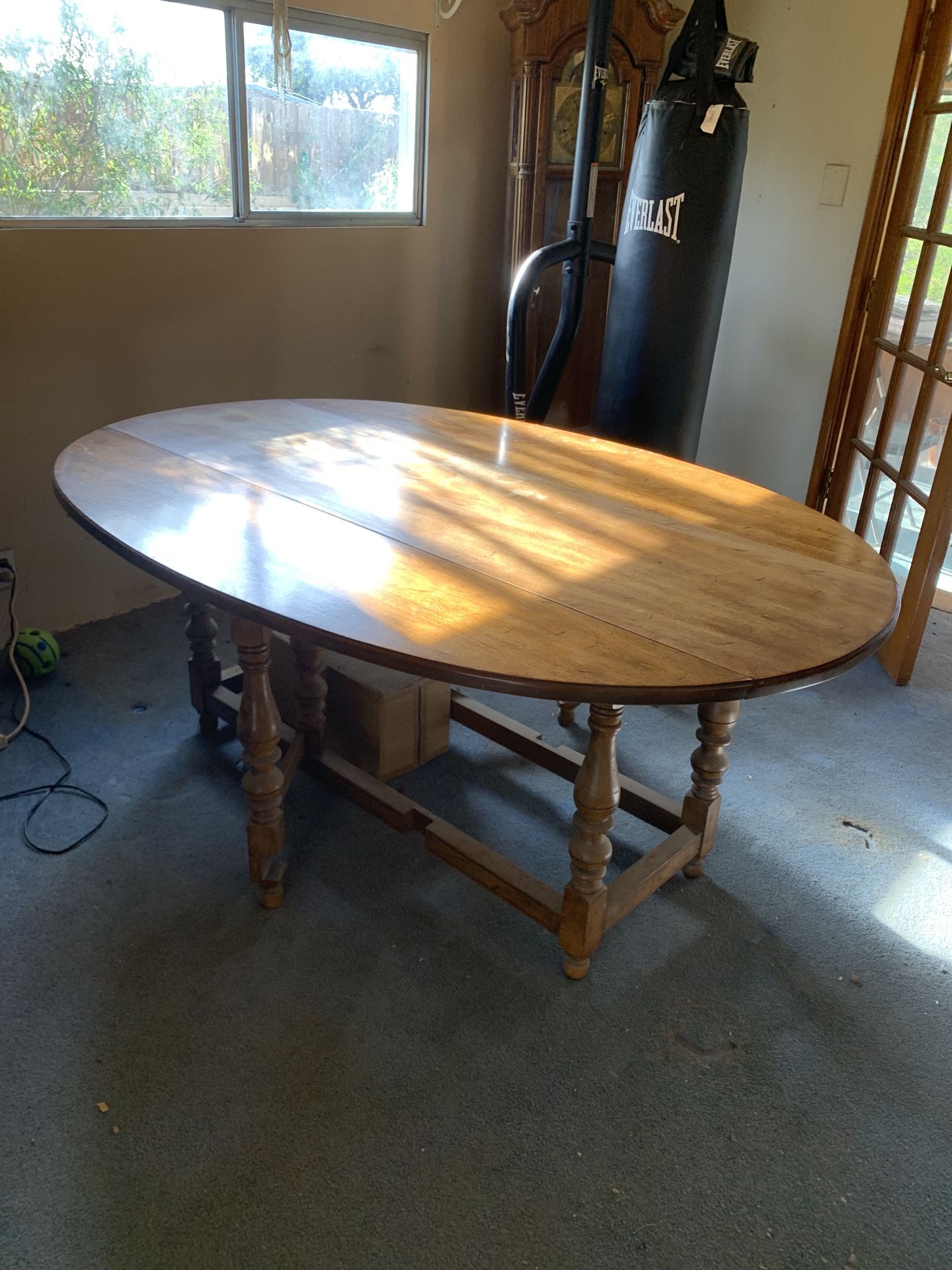 Vintage gateleg drop-leaf table with turned legs, in good condition. This does have a watermark on table. Measures opened 50” wide by 6 feet long and 21 1/2” wide closed. Super solid table.