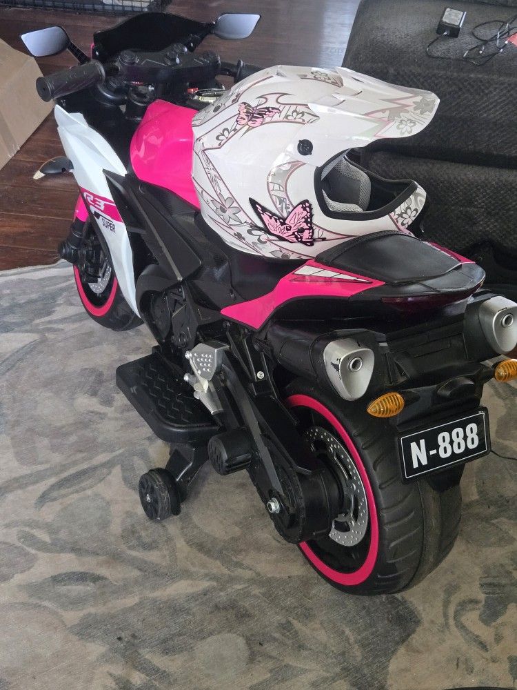 Girls motorcycle and helmet. In great condition. Works great.