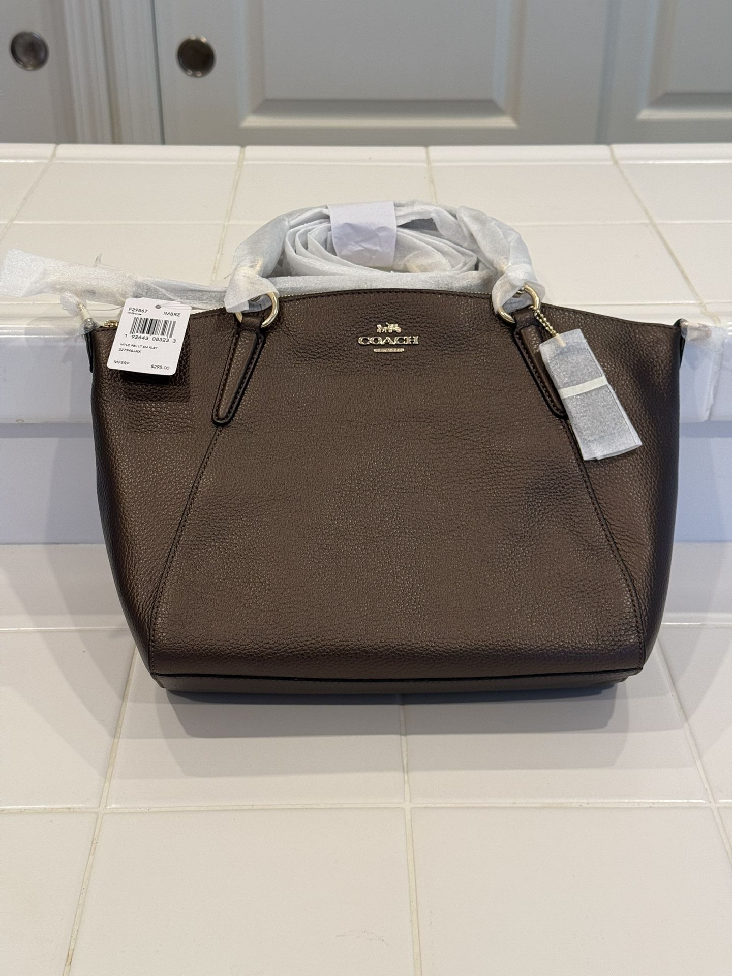 Will make a wonderful Christmas gift. New in manufacturer’s packaging Coach’s Famous Pebbled Leather in a rich brown with Removable changeable handles for handbag or shoulder bag style. The shape is tapered and measures 13 1/2” across the top and 10 1/2” at the bottom. The width at the bottom is 3”. Coach is the Original American House of Leather founded in New York in 1941. Pick up in Napa, cash only.