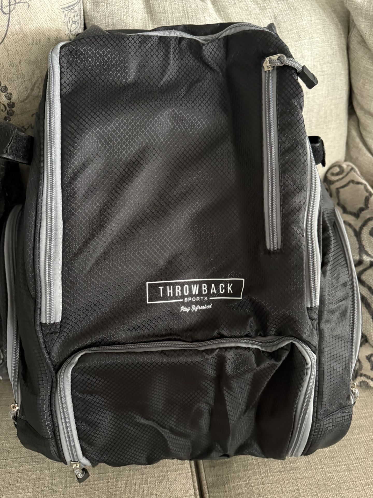 This black backpack from Throwback Sports features multiple zippered compartments and padded shoulder straps. It's made of durable nylon material and includes a cooler section. This pack is designed for athletic gear.
