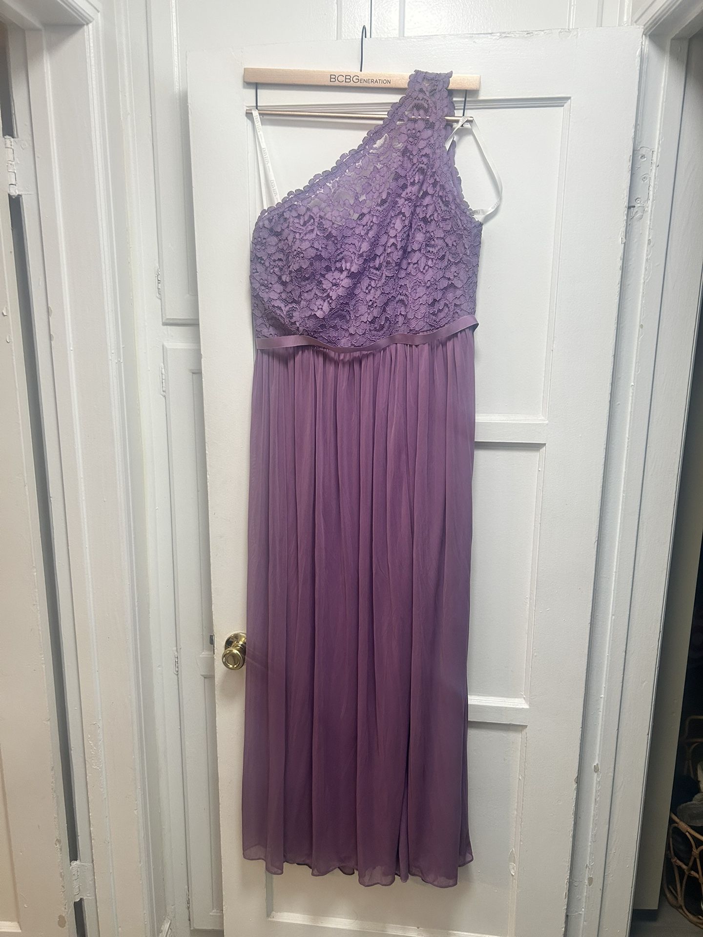 A never worn, beautiful dress from David’s Bridal. It can be worn for a wedding, a bridesmaid dress, bridal shower or birthday. It’s lavender & a nice 16. Very nice fit.