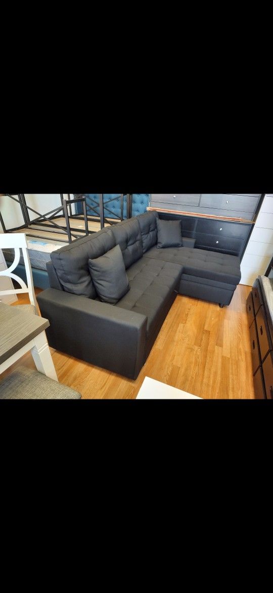 Brand New Sectional Pull Out Bed Black Fabric Reversible Storage Chaise $549 + Tax ELIS FIANANCE AVAILABLE 3 MONTHS SAME AS CASH NO CREDIT CHECK LOW OR 0 DEPOSIT EVERYDAY 11 TO 7 PM