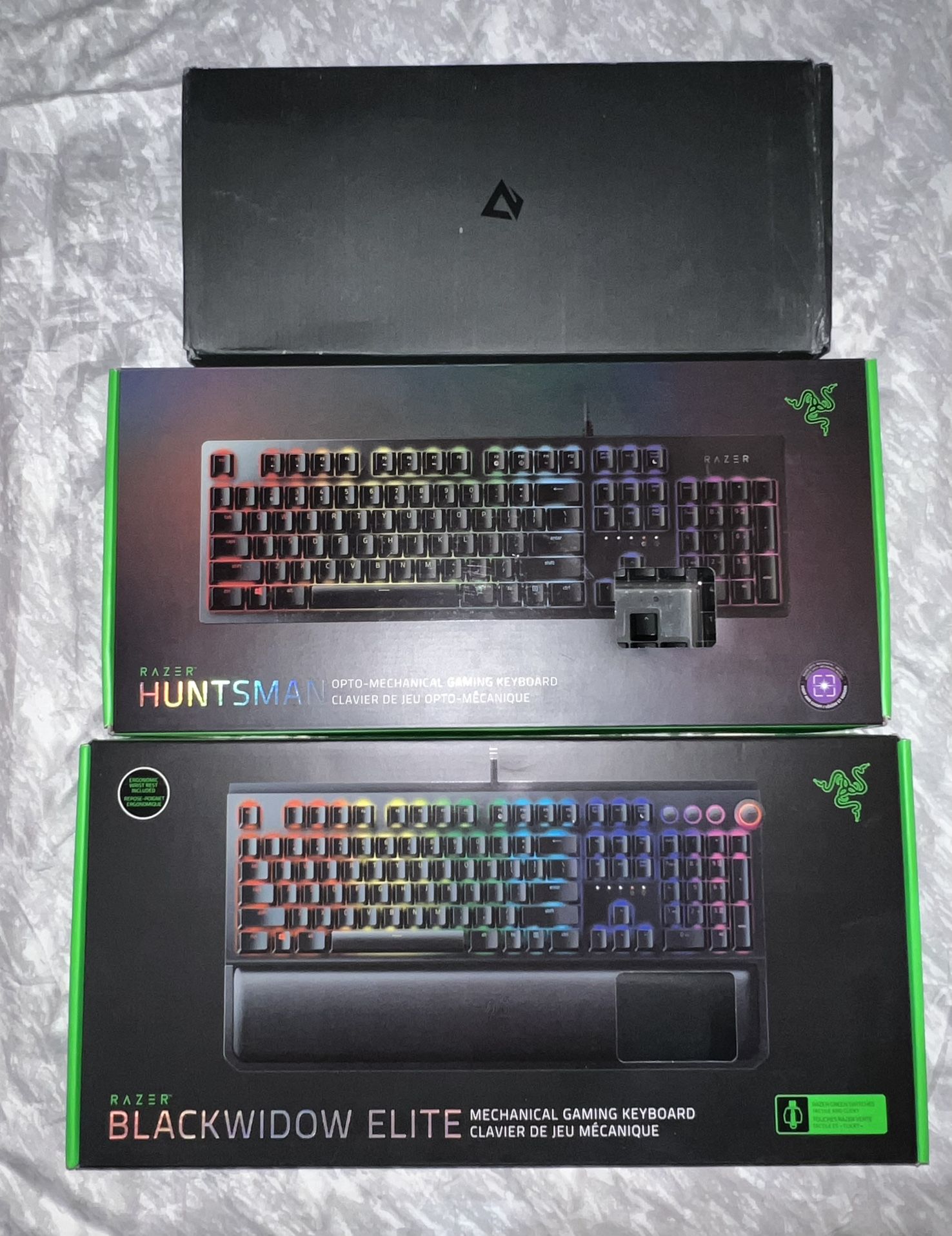Used mechanical gaming keyboards. Razer Black Widow Elite (Green Switches), Razer Huntsman (Purple Switches), Aukey 10 Keyless Keyboard (Blue Switches). All work and are in working condition, they could use some cleaning though. Original boxes are included.
