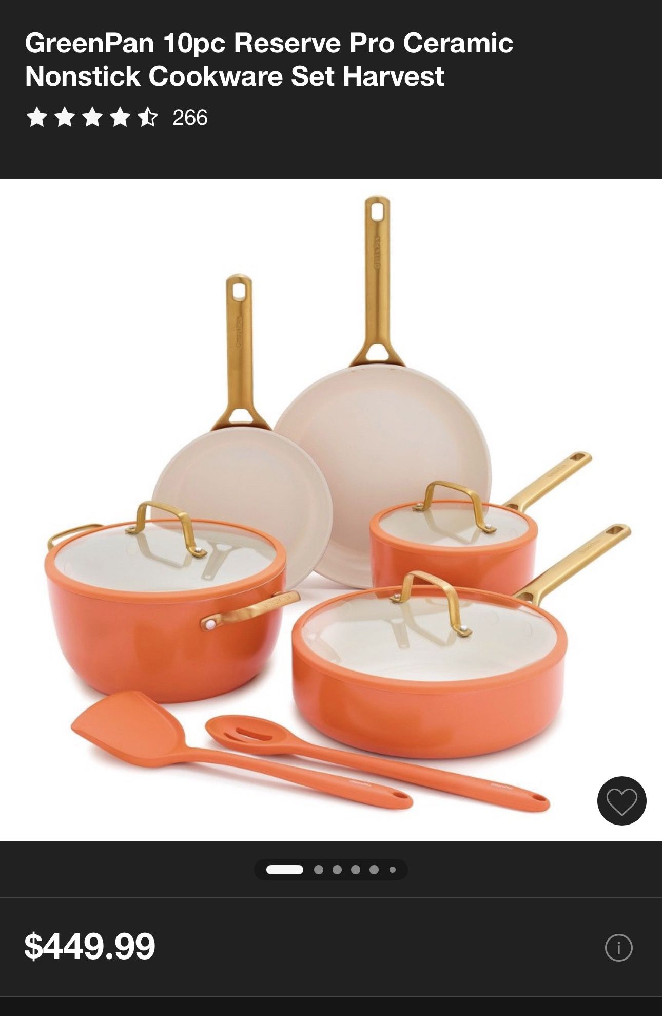 New in box!! GreenPan 10pc Reserve Pro Ceramic Nonstick Cookware Set Black Product Details •RESERVE PRO: A reimagined take on GreenPan’s bestselling Reserve collection, Reserve Pro pairs their most advanced ceramic nonstick with ultra-strong, stackable bodies, oven-ready performance, stylish gold-tone handles, and easy-clean convenience—designed for lasting durability and everyday elegance. •10X LONGER LASTING*: Thermolon 9G is the latest evolution in toxin-free cooking. It delivers supercharged performance, remarkable nonstick release, and next-level scratch resistance. •10-PIECE COOKWARE SET INCLUDES: 2.5QT Saucepan with Lid, 5QT Stockpot with Lid, 8” Frying Pan, 10” Frying Pan, 3.9QT Sauté Pan with Lid, Silicone Solid Turner, Silicone Slotted Spoon •DUOFORGED ARMORED BODIES: Pretreated before they’re hard anodized, these pans deliver extraordinary strength and scratch resistance with uniform heat •BUILT FOR OVEN COOKING: Oven and broiler safe up to 600°F (lids up to 392°F) •And suitable for all stovetops, except induction •NO HOT SPOTS: 4mm thick heavy-gauge aluminum base delivers even heat distribution. •DURABLE DOMED GLASS LIDS: The tempered glass lids feature a silicone rim to lock in heat and moisture so you can watch all the action on the outside •EASY TO CLEAN: These pans are dishwasher safe for easy cleanup, but most messes will wipe clean Description GreenPan has reimagined their bestselling Reserve collection with subtle architectural details and a sophisticated edge—introducing Reserve Pro, where form meets groundbreaking function. Inspired by neoclassical design, this collection makes a stunning contemporary statement in any kitchen. At the core is Thermolon 9G, GreenPan’s most advanced ceramic nonstick coating yet. Infused with diamonds for incredible durability and responsiveness, it’s metal utensil safe, free of PFAS, and crafted for confident cooking morning to night. The duoforged hard anodized aluminum body offers lasting strength and even heat distribution, while gold-tone stainless steel handles add a refined touch and a secure, comfortable grip. Finished with durable glass lids featuring a silicone rim to seal in heat and flavor, this collection is oven safe up to 600˚F (lids to 392˚F) and dishwasher safe for effortless cleanup. Number of Pieces: 10 Baking Cooking Surface: Ceramic, Nonstick Features: Made without PFOA, Made Without PTFE Includes: Solid Turner, Slotted Spoon, 8" Frying Pan, 5 Quart Stockpot With Lid, 10" frying pan, 2.5 Quart Saucepan With Lid, Saucepan With Lid Piece 1 pot or pan diameter: 8 Inches Piece 2 pot or pan diameter: 10 Inches Cooktop compatibility: Electric Coil, Gas Material: exterior surface: Hard Anodized Aluminum Care & Cleaning: Hand Wash, Dishwasher-Safe