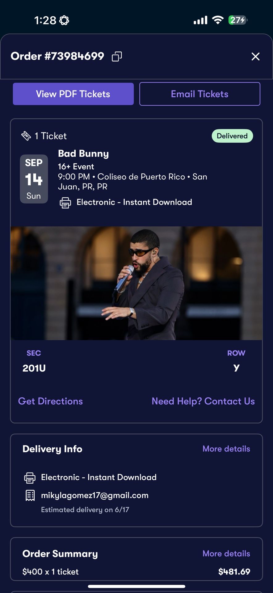 Bad Bunny concert ticket for 09/14 @9pm. **ONLY 1 SEAT**