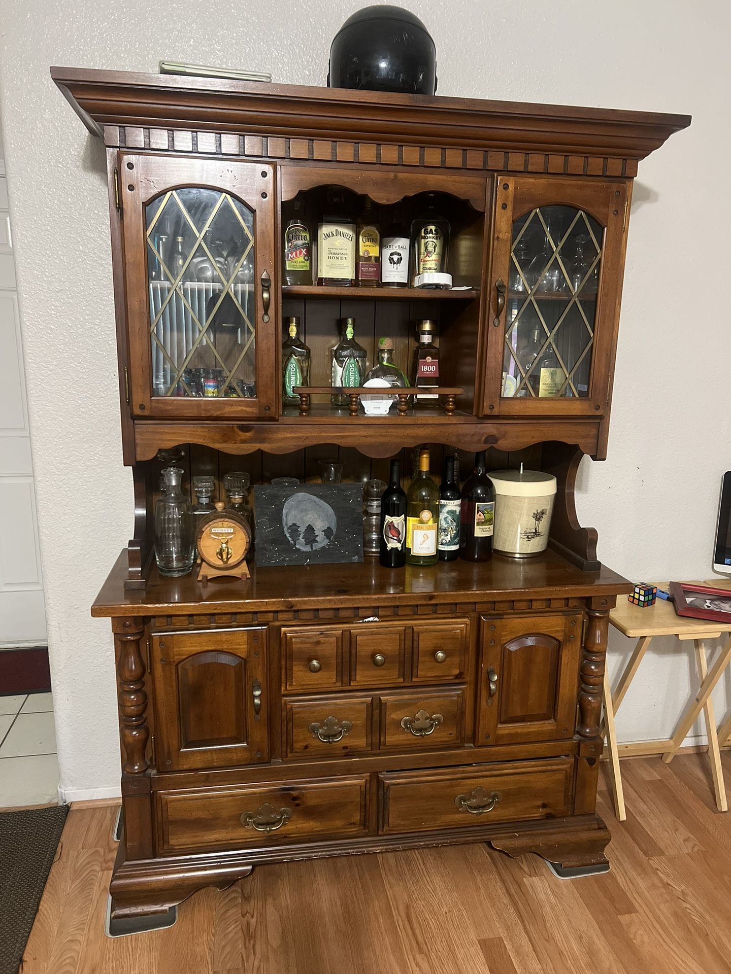 Wood bar, glass cabinets on the sides. Storage space on bottom.