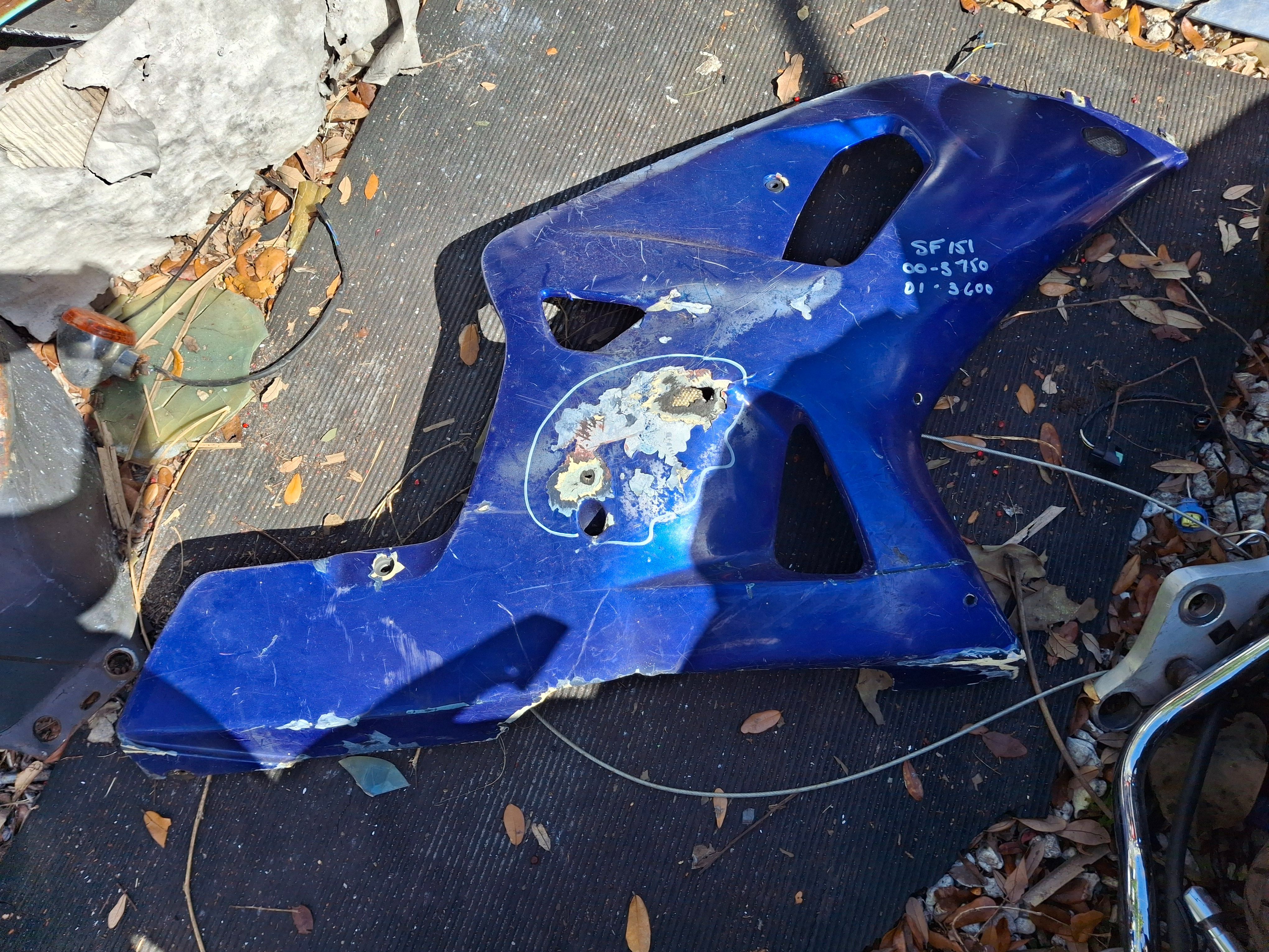 This listing is for an right side fairing off of an 00-03 GSXR 750 and 01-03 GSXR 600. This fairing is damaged, as you can see there are some scratches and some rash on the item. There is an area in the middle of the fairing that you can see is rubbed all the way through. There is also some damage towards the bottom of the fairing. This is an OEM fairing, part number 35F. This would be best if you have a stunt bike and need a replacement fairing or if you just need something cheap in a pinch. We prefer local pickup for fairings as shipping is very high. Please look closely at all pictures and ask all questions prior to purchase. SF151