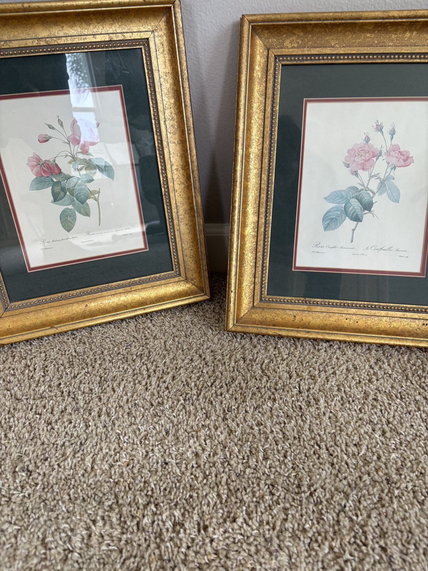 Elegant botanical prints with gold frames Prints 11 x 14 Frames approximately 16 x 18 Pastel rose botanicals with dark green mattes Lovely wide gold frame with beading detail