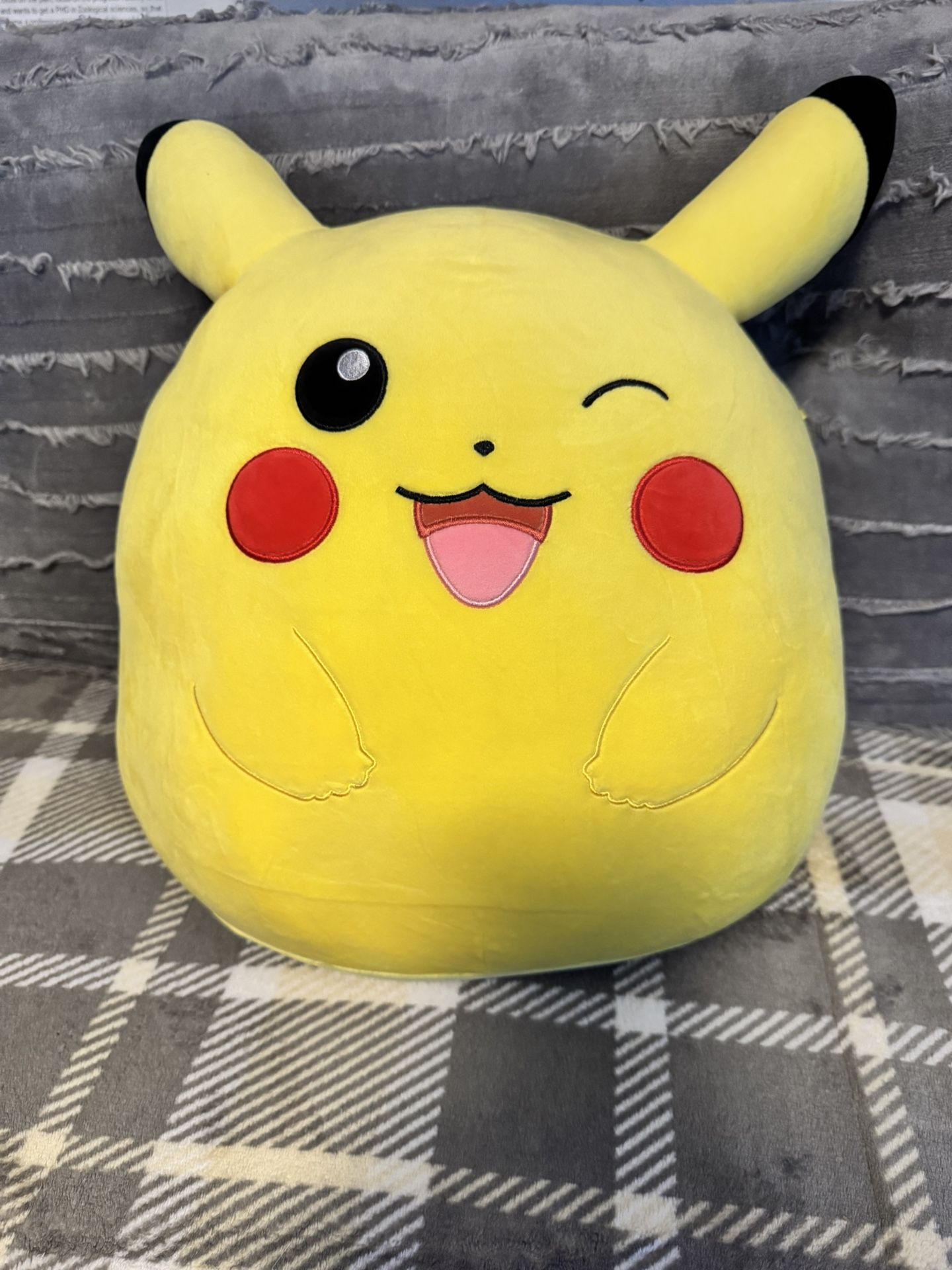 Title: BRAND NEW WITHOUT TAGS 14 INCH POKEMON PIKACHU SQUISHMALLOW PLUSH WITHOUT TAGS Hi! Today I am selling my brand new Pikachu Pokemon Squishmallow plush without its tags! It's a huggable 14 inches and it has never been played or cuddled with. It's only been in my bundle of stuffed animals on a shelf. It's adult owned and comes from a pet and smoke free household. It has absolutely no stains or holes. I'm asking fifteen dollars for it, it was originally 35. Thank you! Pick up in Vancouver Washington only.
