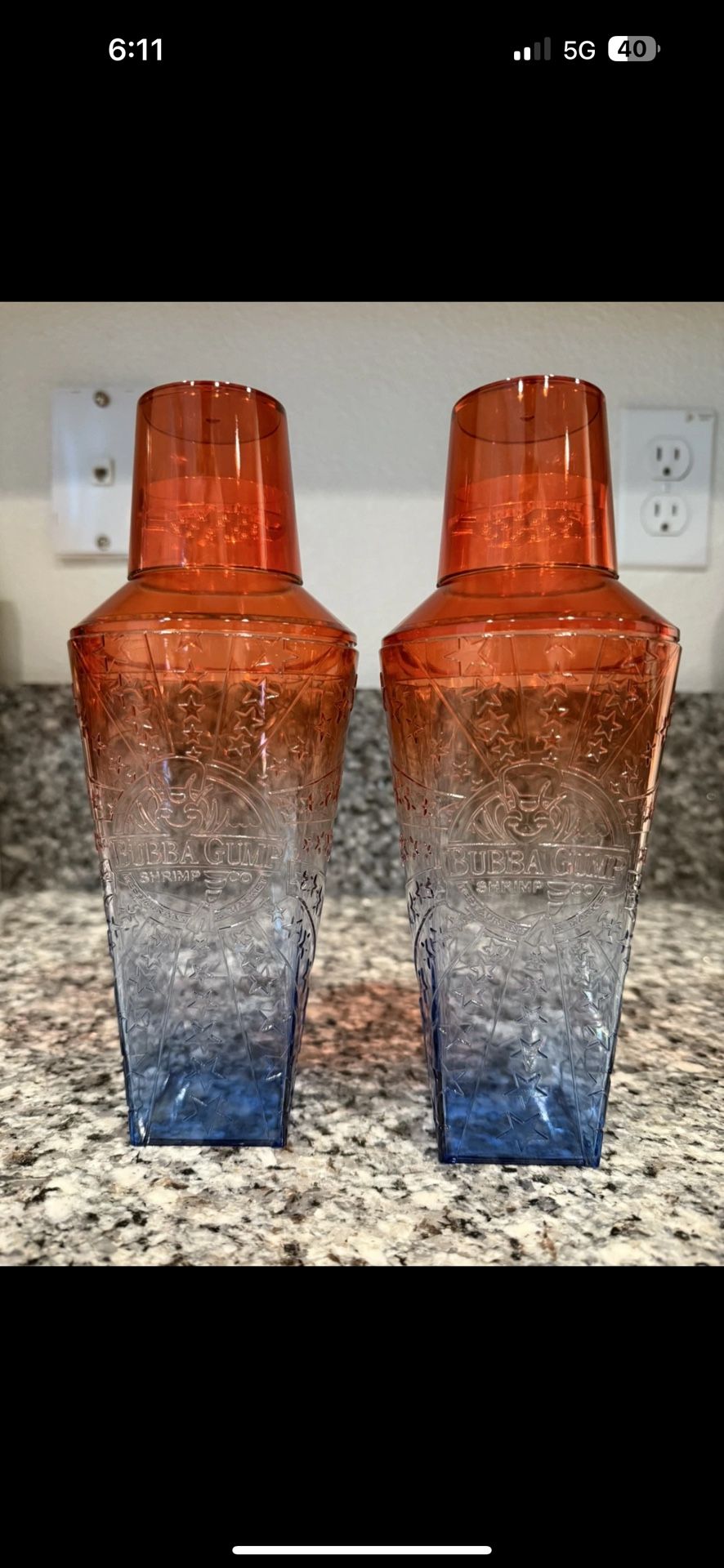 $10 OR BEST OFFER! I have a set of two Bubba Gump shakers with shot glass. Shaker can be used as a glass to drink your beverage. It is new and unused. It comes in the original plastic wrap. It was removed from the wrap just to take the photos.