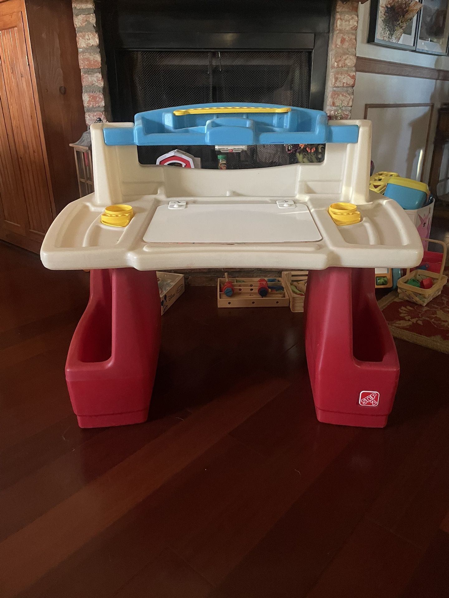 Step 2 Desk w/chair. Grandson has outgrown and making room . Very good condition . 2 side cubbies to store books . Desk top opens has storage space. Has a working desk light. We are in the SDSU/Rolando area. Cost $100.00