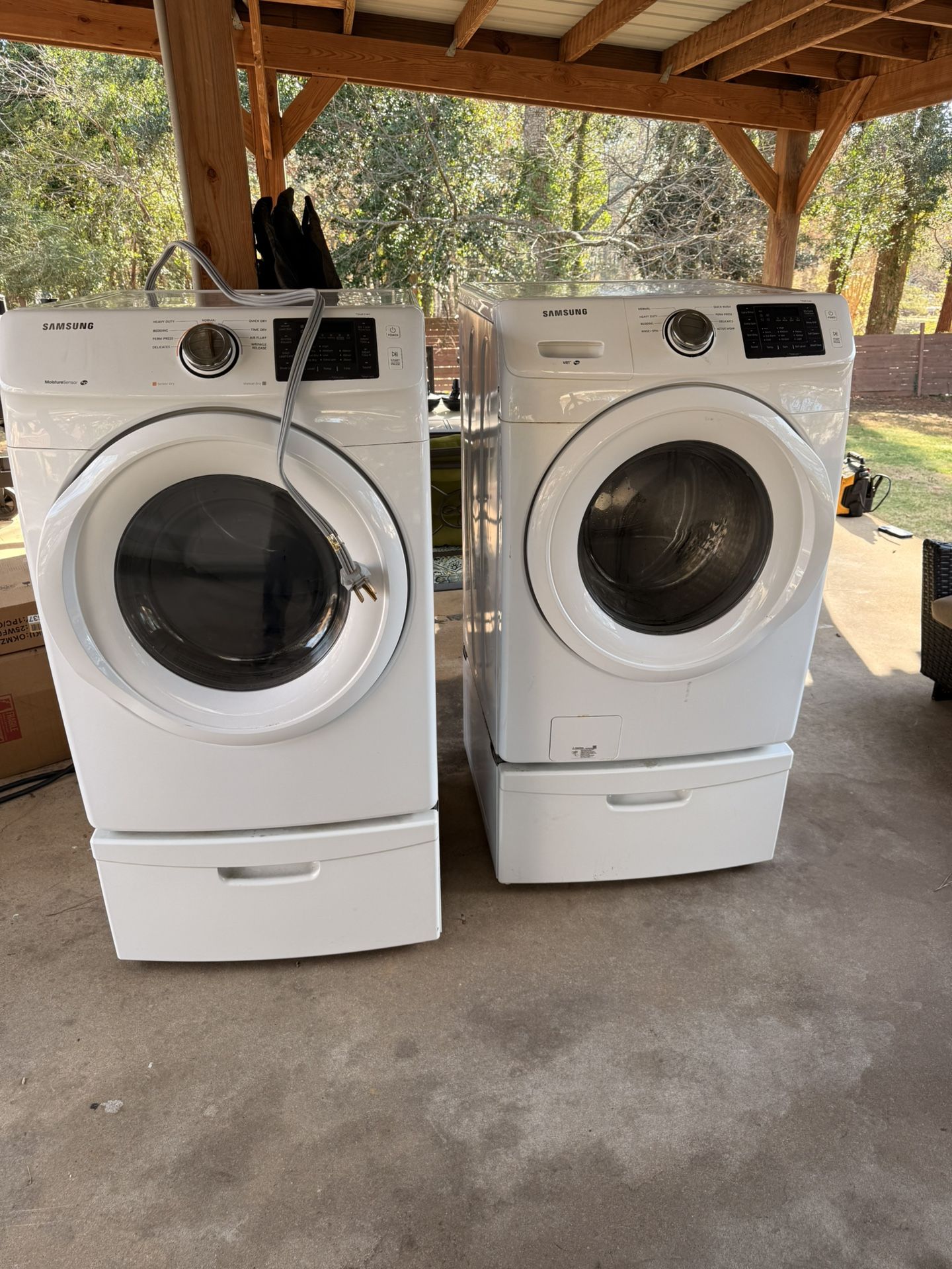 Selling a matching Samsung front-load washer and electric dryer set with pedestals. Both are in great working condition and well cared for. Details: • Samsung Washer Model: WF42H5000AW • Samsung Dryer Model: DV42H5000EW • Large capacity • Energy efficient • Clean, no mechanical issues • Includes washer pedestal drawers • 220V electric dryer (standard hookup) Perfect for a home, rental property, or Airbnb upgrade. Pickup: Local pickup only 🚚 You haul