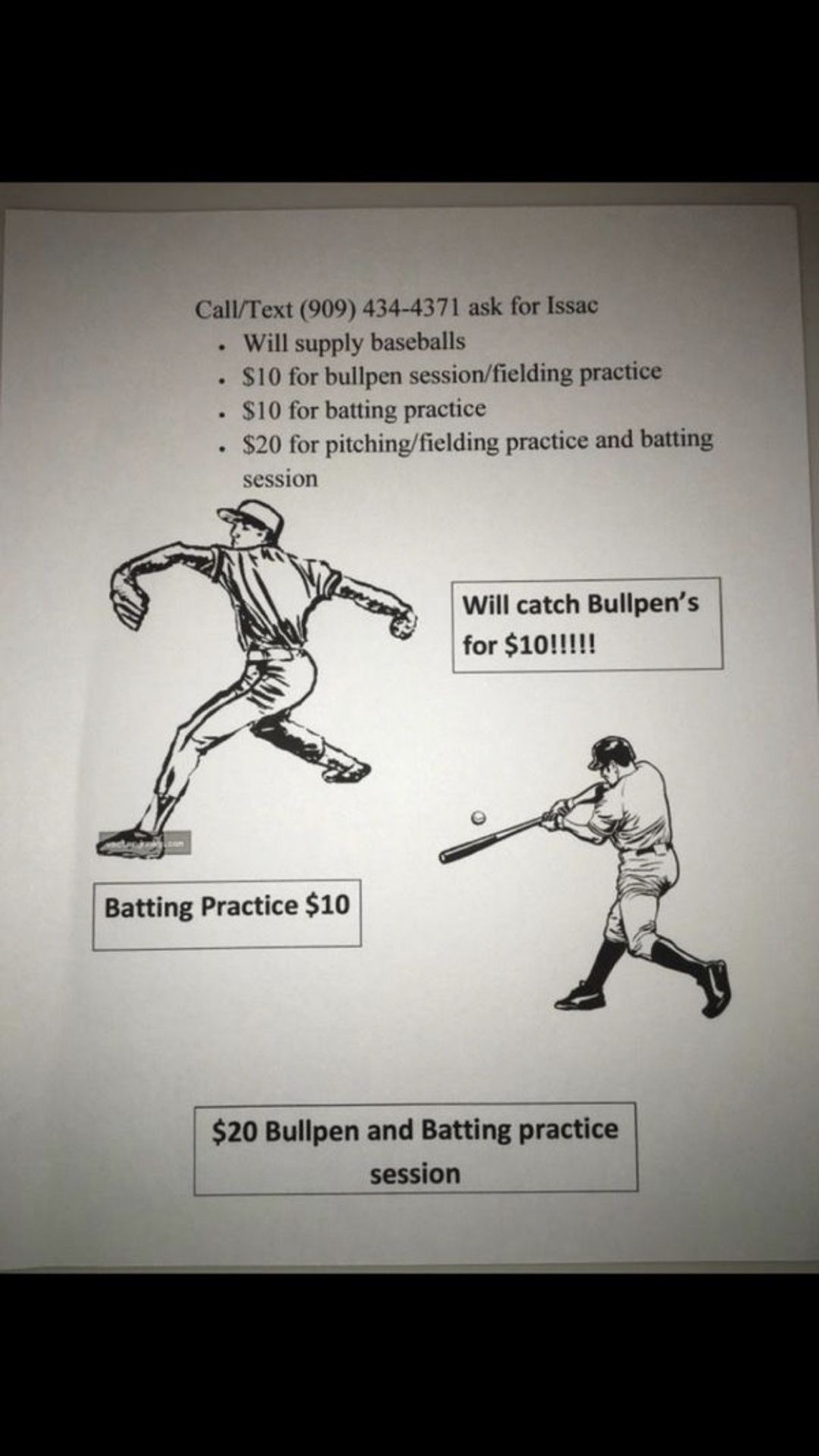 Get ready and in shape for the new season! Will work with children, teenagers and adults of any age. Out of Chino will travel depending on distance Will supply baseballs. Message me for any details and to schedule a date to practice. Over 15 years of baseball experience $10 for batting practice $10 for pitching bullpen $10 for fielding practice