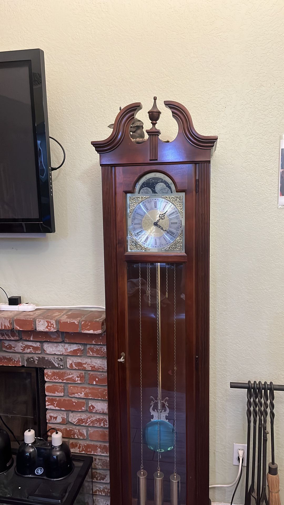 Howard Miller Grandfather Clock – Excellent Condition Beautiful solid wood grandfather clock in cherry finish. Fully functional with working chimes, pendulum, and weights. Features a classic moon phase dial and glass panels on front and sides. No cracks or scratches in glass. Very well maintained. This was a family piece and has been kept in great condition. Local pickup only due to size and weight.