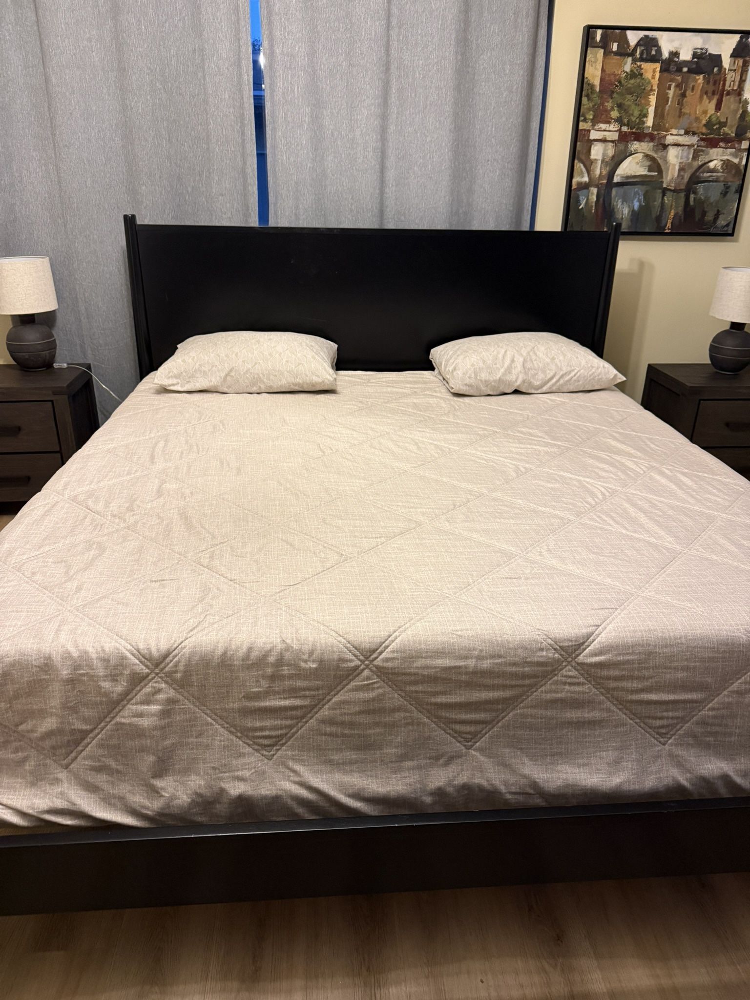 New no flaws Used as staging Comes with everything pictured: mattress, frame, sheets, blanket, 2 pillows Pick up in Pasadena