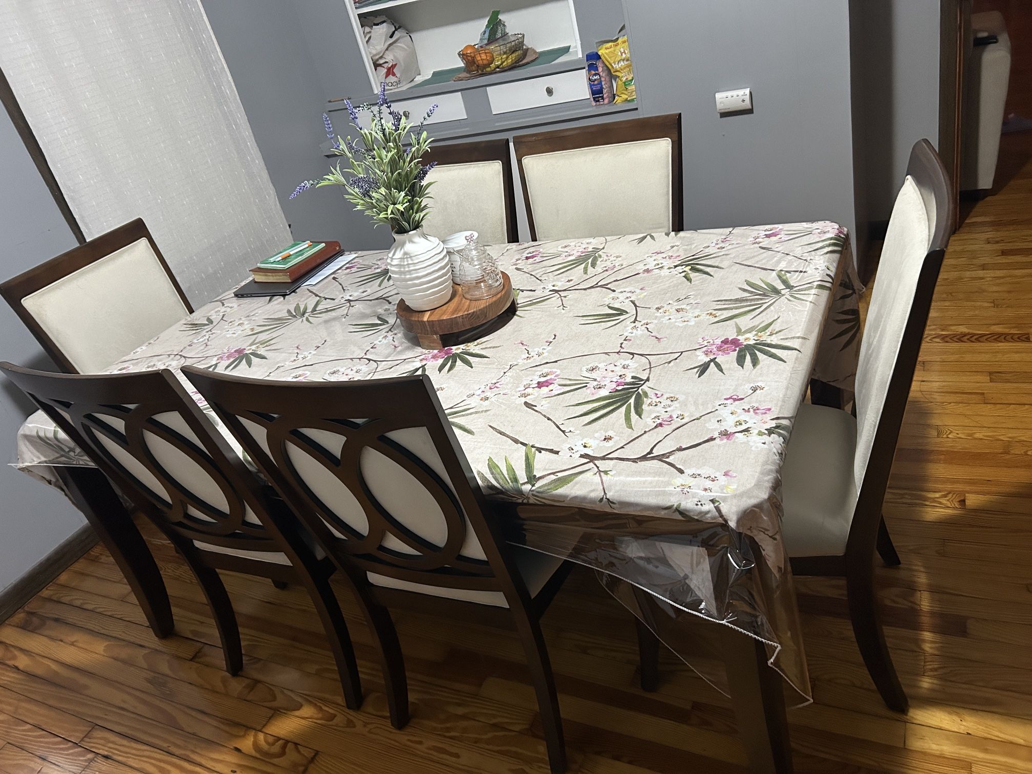 Beautiful dining table set with 6 chairs, only 1 year old. The table includes an extension leaf that can be added to make it larger, perfect for hosting guests. Very well maintained, sturdy, and in excellent condition. From a clean, smoke-free home. Ready for pickup.
