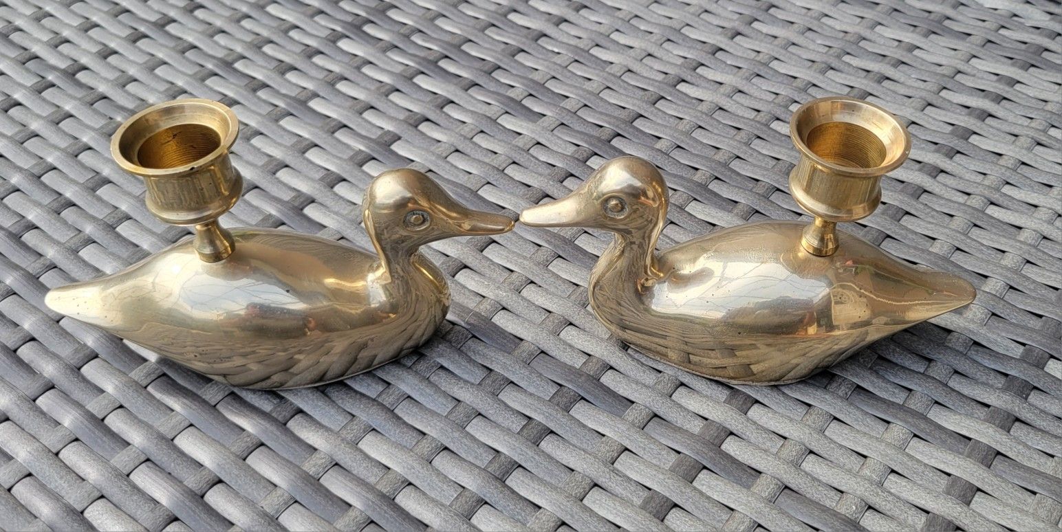 Add a touch of mid-century modern charm to your home decor with this set of two vintage brass candle holders featuring a cute duck design. Measuring 3.5 inches in height and 6 inches in length, these candle holders are the perfect size for any occasion. The gold color and intricate design make them a beautiful addition to any room. Crafted from high-quality brass, these candle holders are durable and suitable for candle sticks. The Duck brand adds a unique touch to your decor, making them a great gift for all occasions. Perfect for collectors and those who appreciate unique home decor, these candle holders are a must-have. Please view pics for details. Feel free to ask if you have any questions.