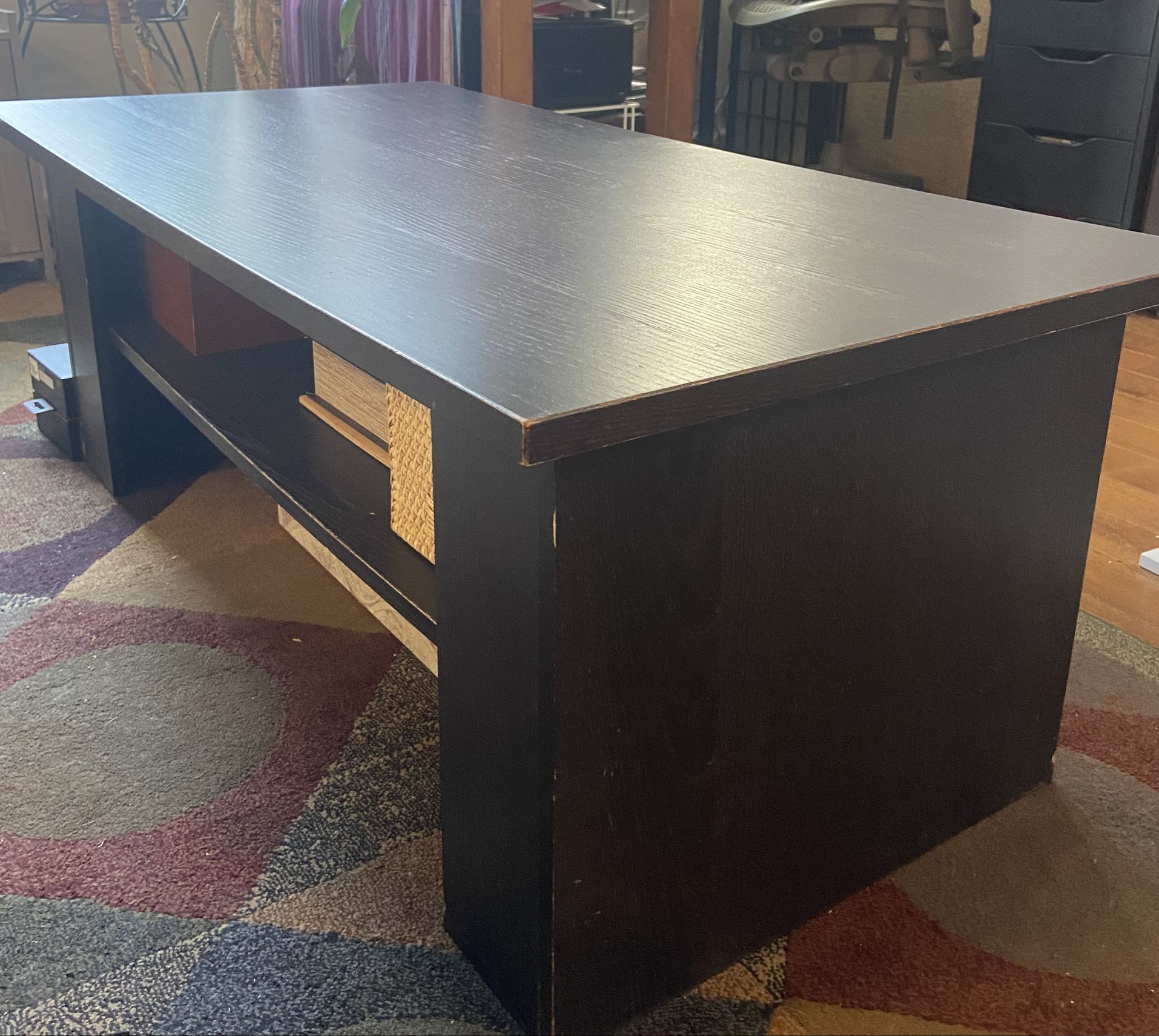 Dark wood rectangular coffee table with lower storage shelf. Clean modern design with solid construction. Great for living room use with space for books, baskets or decor underneath. Good condition, some surface wear on top (see photos), structurally solid.