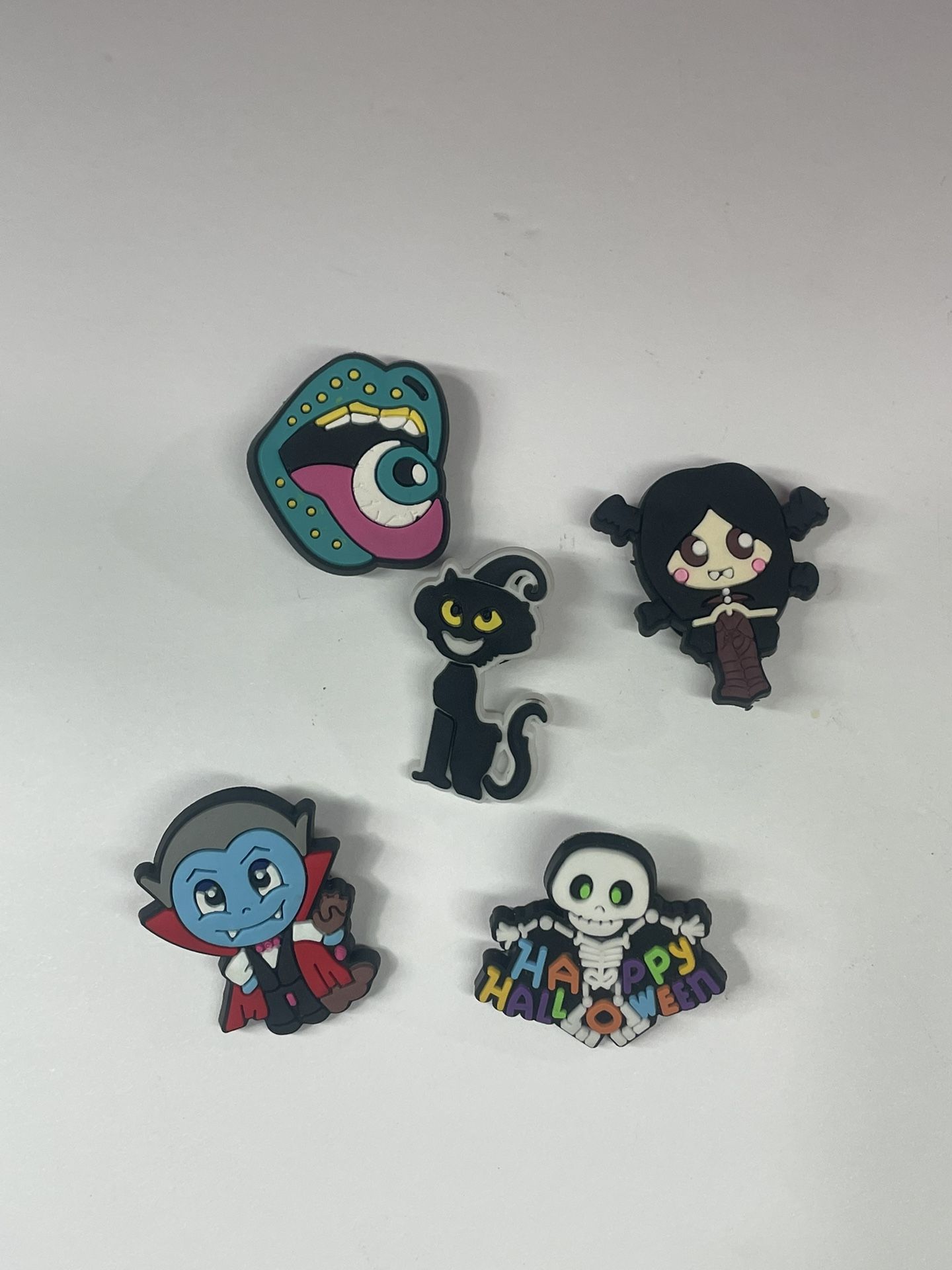 5 Halloween theme crock shoe charms includes vampire, boy, vampire girl, black cat, happy Halloween skeleton and mouth with eyeball