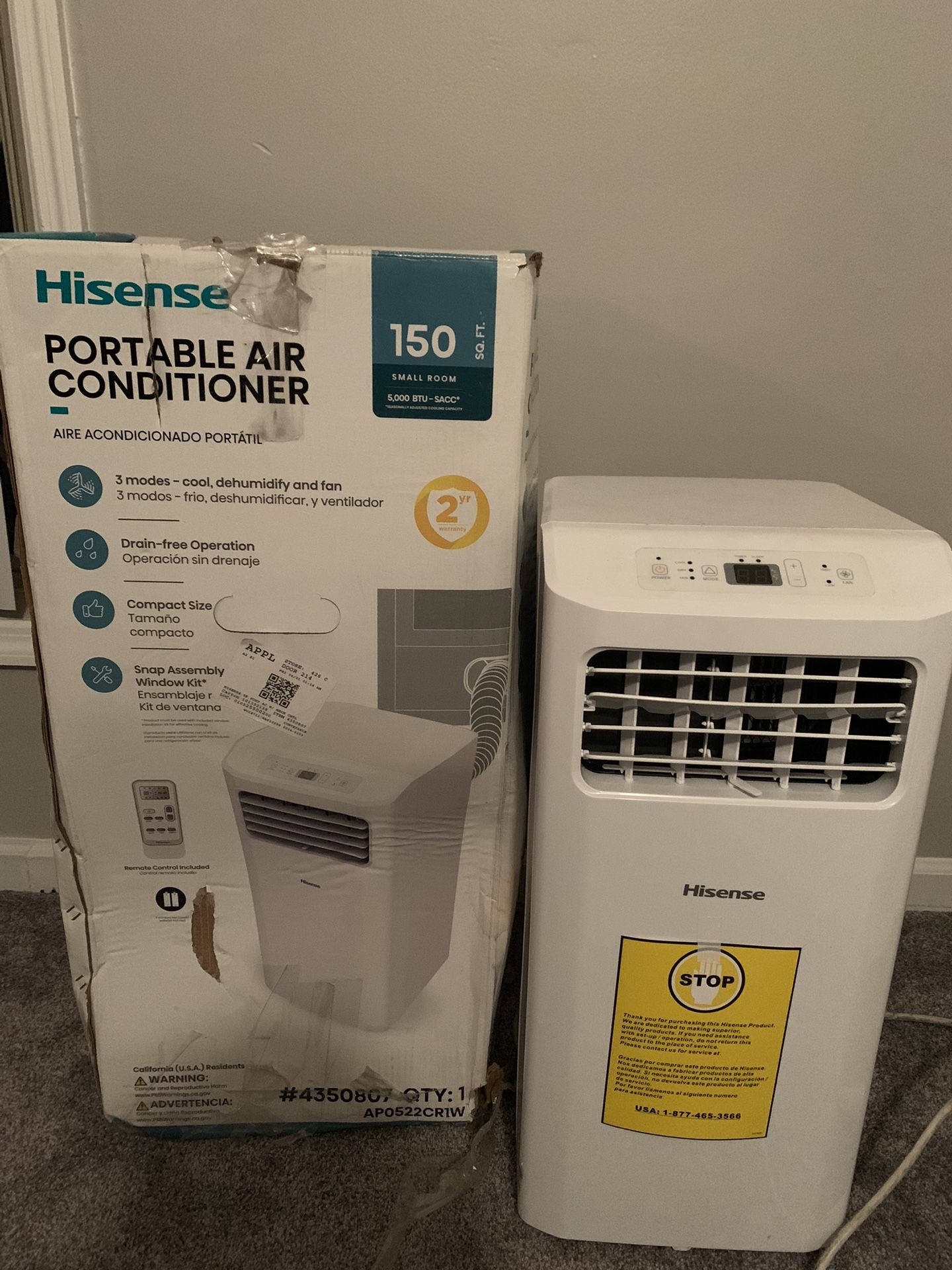 Hisense portable Air Conditioner 5000 BTU 159 square feet with remote only used once in perfect condition with remote and all attachments. Willing to negotiate price within reason.