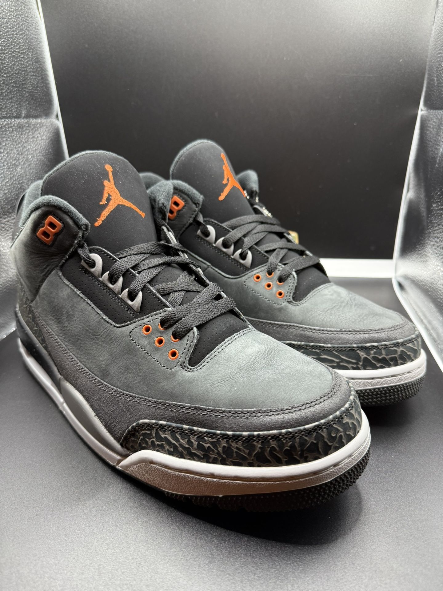 The Size 12 Air Jordan 3 Retro Fear Pack is a stylish and iconic sneaker from the Air Jordan line, released in 2013. This athletic shoe features a gray colorway with the signature Air Jordan 3 model design. With a brand as prestigious as Jordan, this sneaker is highly sought after by collectors and sneaker enthusiasts alike for its classic style and unique design elements. Perfect for men who appreciate quality and style in their footwear choices. Brand new, tried on, no box. Rep insoles. Left shoe back has chips in the orange paint (Jumpman Air). Other than that, shoes look good.