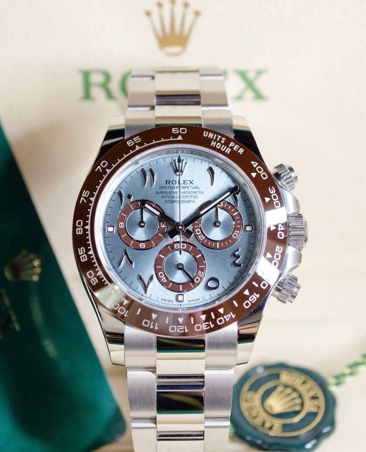 ice blue dial with brown ceramic tachymeter bezel and stainless steel bracelet. Automatic chronograph movement, crisp subdials, and iconic Daytona design. Extremely clean, high-end piece that stands out in any collection. Watch is in excellent condition and comes with original box (shown).
