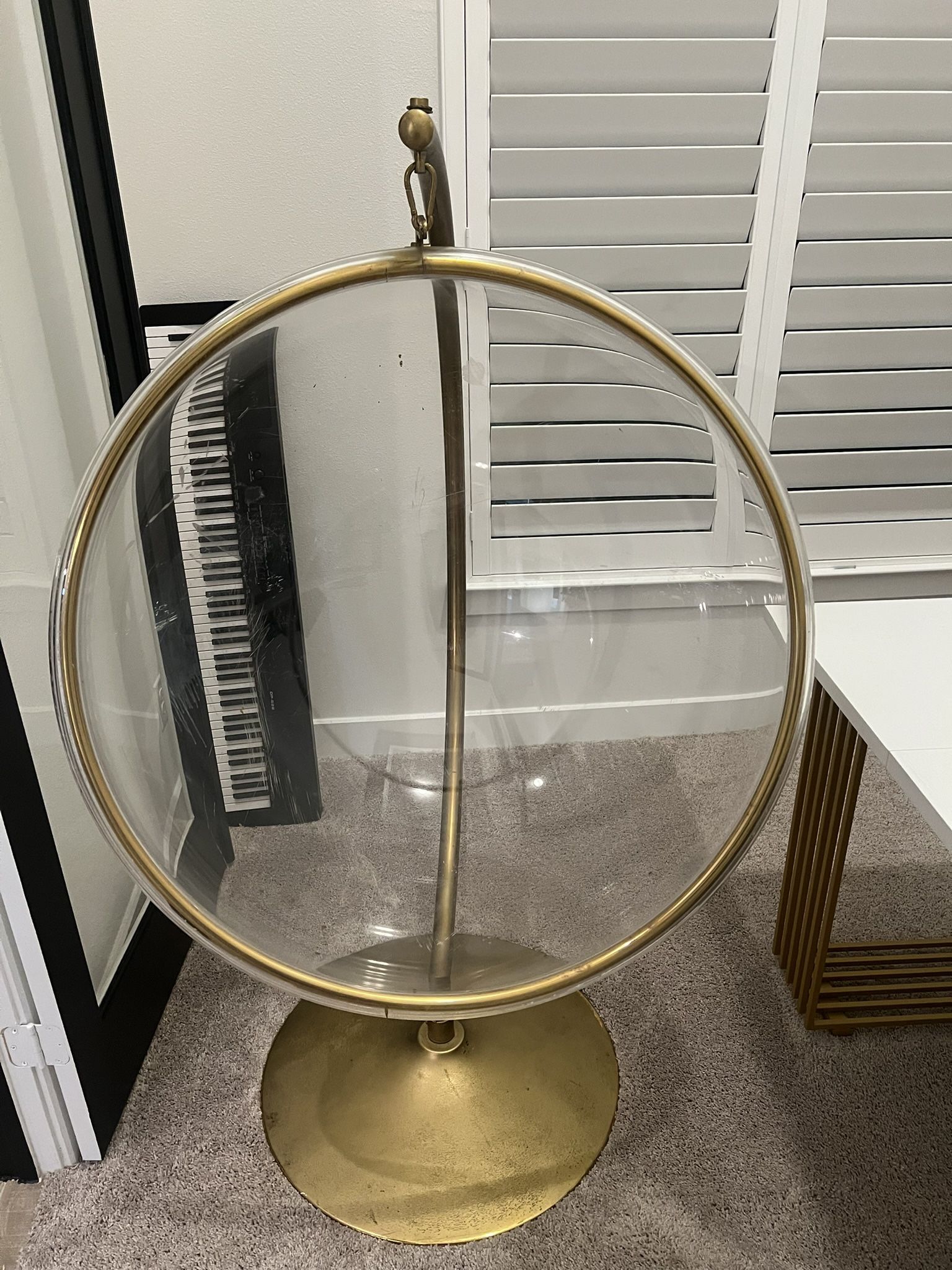 Upgrade your space with this stylish acrylic hanging bubble chair, featuring a sleek gold metal frame and sturdy base. A perfect blend of luxury and modern aesthetics, this chair is ideal for a glam lounge, office, or statement corner in your home. ✨ Features: ✔️ Clear acrylic bubble design for a modern, airy feel ✔️ Gold metal frame and base for a luxe, contemporary look ✔️ Comfortable hanging design with swivel movement ✔️ Great for a chic living space, office, or creative lounge 🔹 Condition: This chair is in great functional condition with some minor scratches on the back (reflected in price). Still a stunning, eye-catching piece!