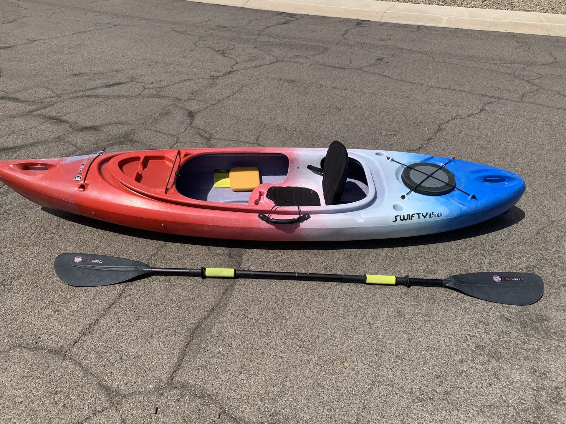 Perception Swifty 9.5 DLX Fishing Kayak 2019 Red, White & Blue Perception Swifty 9.5 DLX Kayak in great condition. With added side handle/paddle holder, fishing rod holder and anchor trolley. Comes with Paddle Length: 9’ 6” Weight: 41lbs Width 28.5” Max Capacity: 325lbs