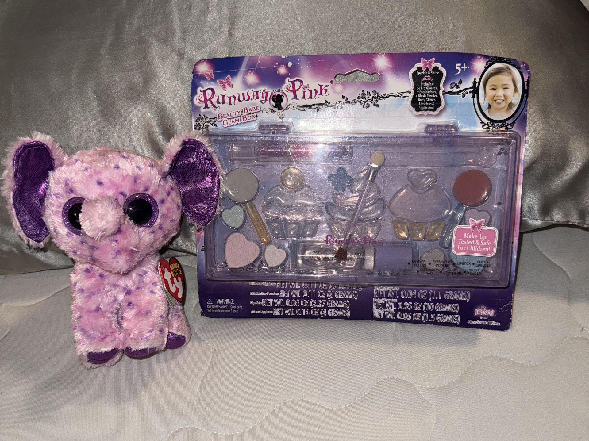 Charming Ty elephant plush Eva. Soft pink and purple design. Perfect for kids' playtime. The beauty glam box is recommended for ages five and up, and it contains lipgloss, eyeshadow, blush powder, and more! My granddaughter who is 6 has one of these and she just loves it!!