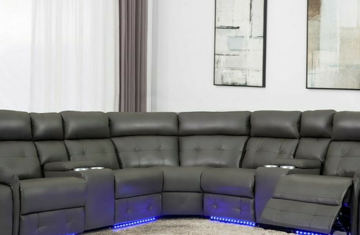 Brand New Grey Leather Power Reclining Sectional With Built In Cup Holders & Led Lights