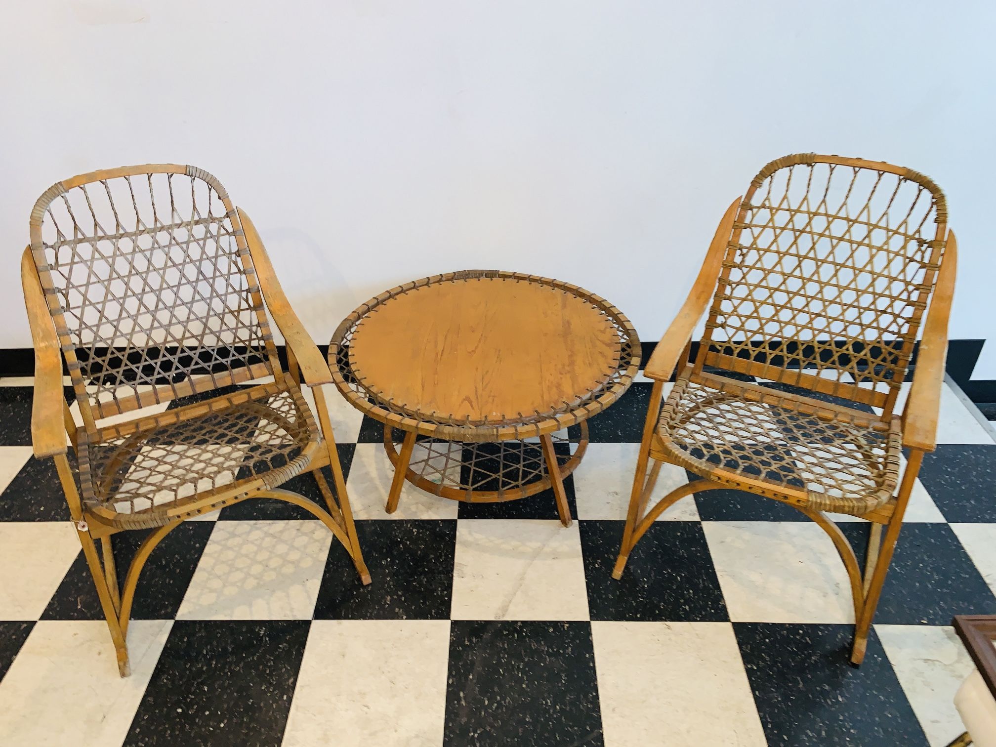 Vintage Snowshoe Arm Chairs And Coffee Table by SnoCraft, Norway Maine