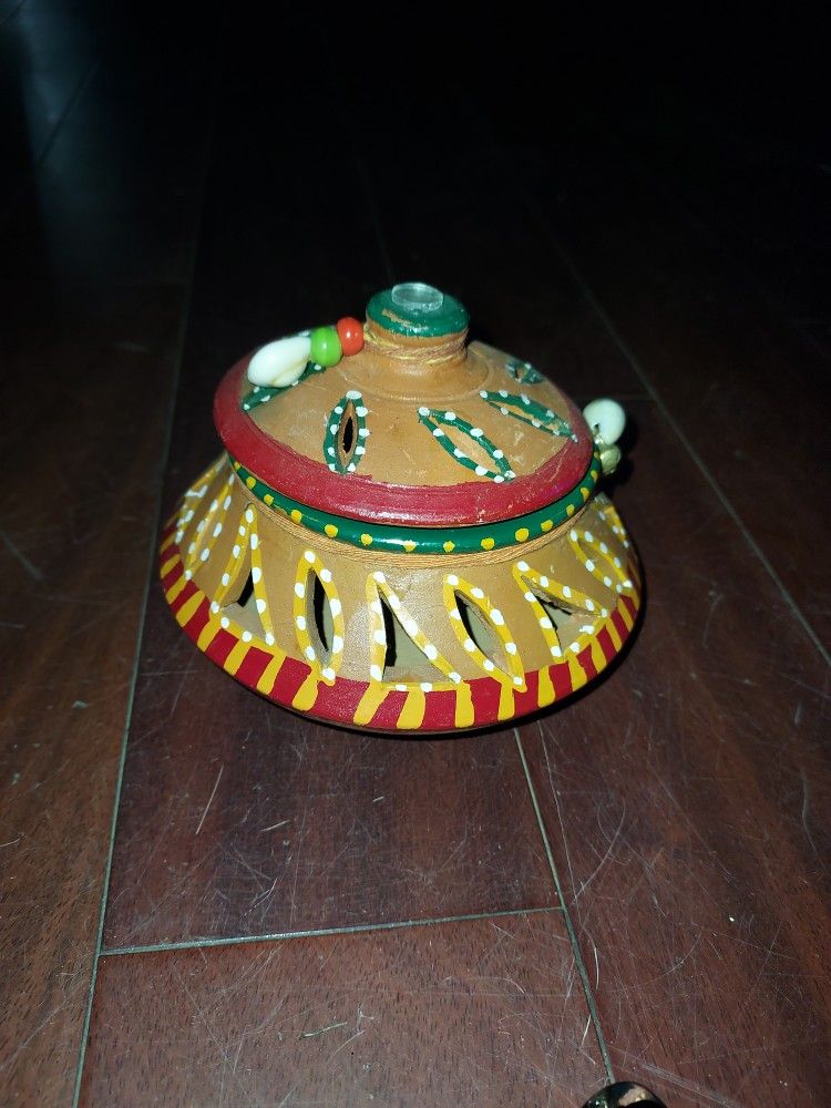 Small clay pot with lid; hand painted and made in Pakistan. In addition to displaying as a decorative item, this jar is perfect for storing jewelry, coins, and other small items.