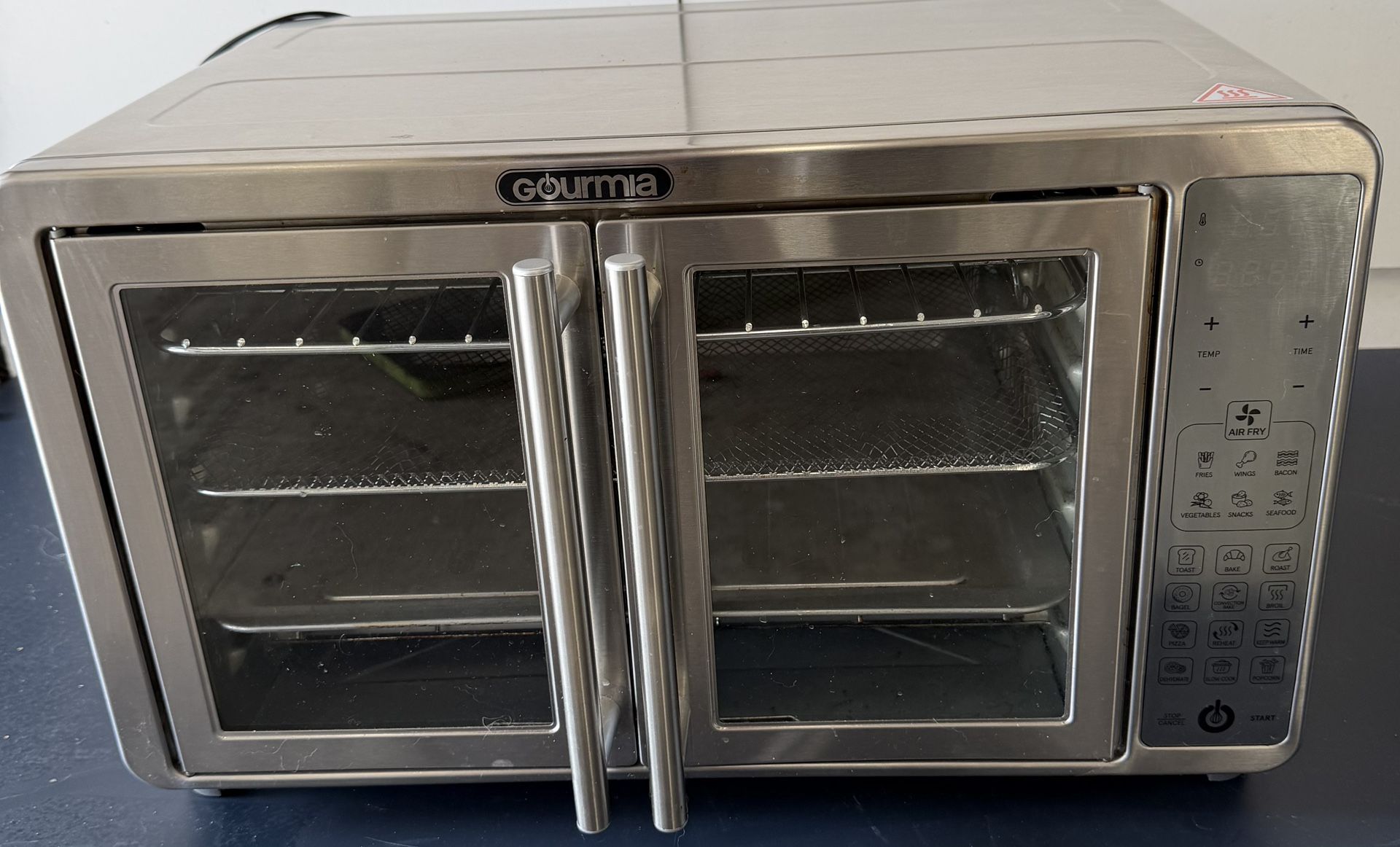 Gourmia French Door XL Digital Air Fryer Oven – Model GTF-7690 – Excellent Condition - $100 This is the large French-door style model — great for families or meal prep. Features: Extra-large capacity (fits a 12" pizza or multiple trays) French door design (both doors open with one pull) Digital display with easy-touch controls Multiple cooking functions: Air Fry, Bake, Broil, Toast, Dehydrate, Roast, and more Includes racks, air fry basket, and crumb tray Stainless steel finish Heats quickly and cooks evenly. Perfect for air frying, reheating leftovers, baking, or roasting vegetables and meats.