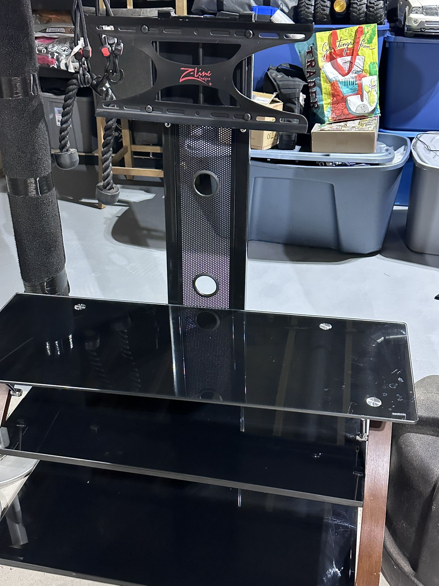 Z-Line Designs glass TV stand with integrated TV mount. Sturdy metal frame, multiple glass shelves for cable box, gaming consoles, or sound system. Clean and well-kept. TV not included. Local pickup only.