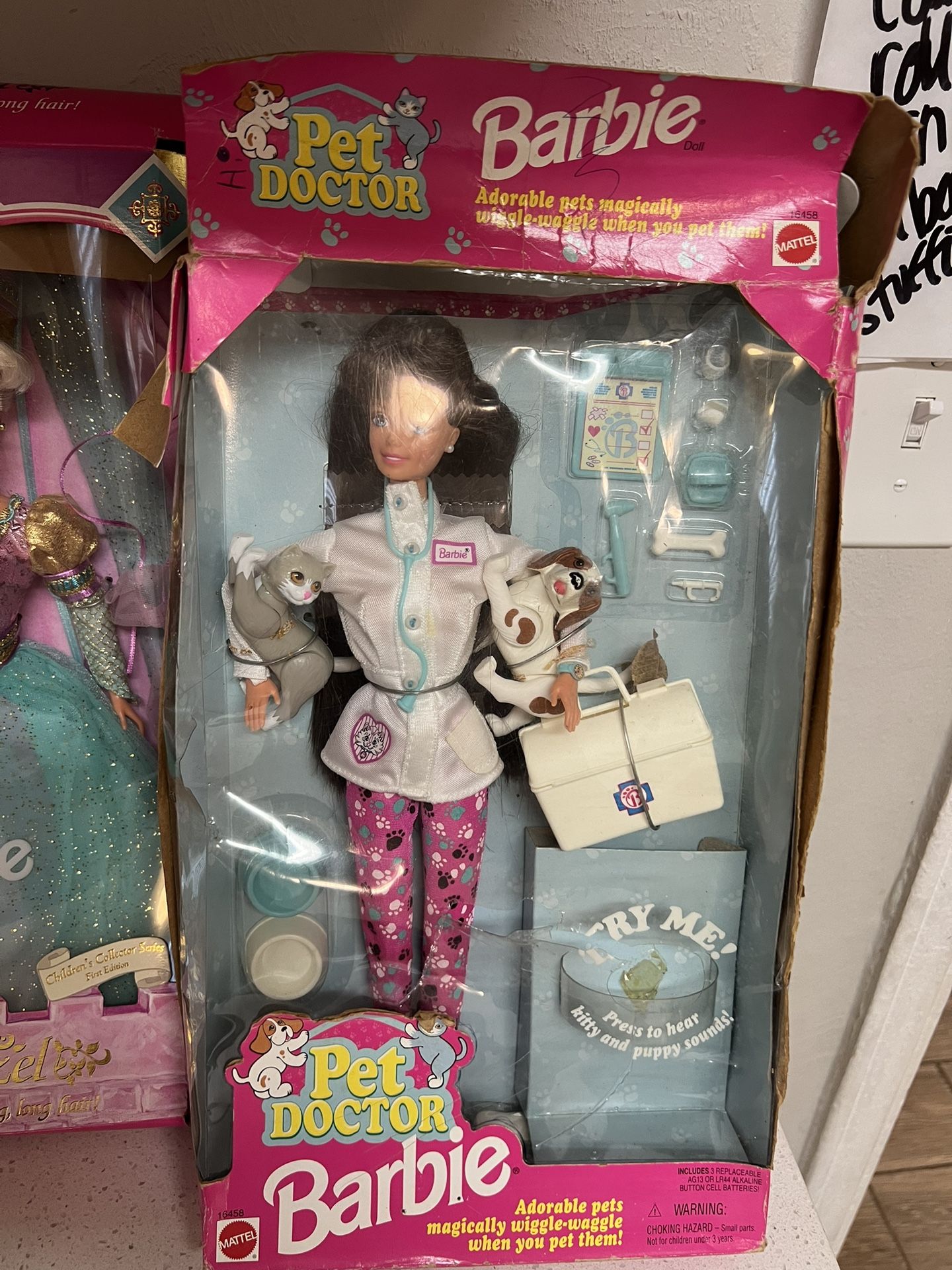 Pet Doctor Barbie doll from 1996. This specific version features a brunette doll in a vet outfit with animal patients that make sounds. Box damage $15