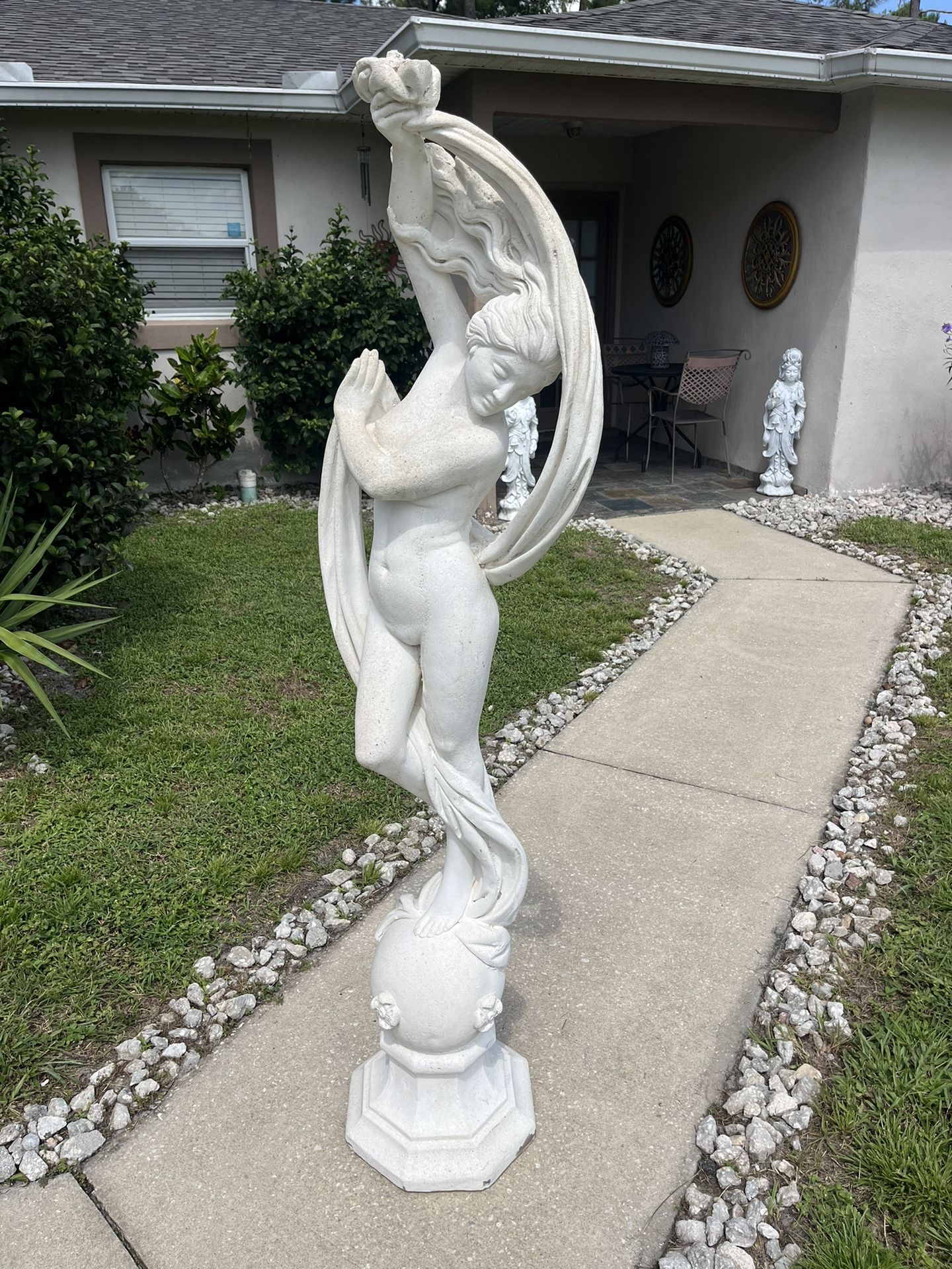 This beautiful goddess aurora statue is over 20years old but still in excellent condition. Very heavy solid stone made here in Florida with the stamp.