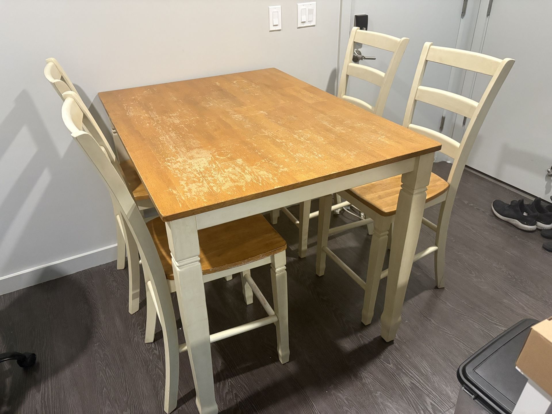 Classic farmhouse kitchen table. Comes with 4 chairs but can seat 6. Well loved. Worn, but has lots of life left in it - just simply doesn’t fit in our space.