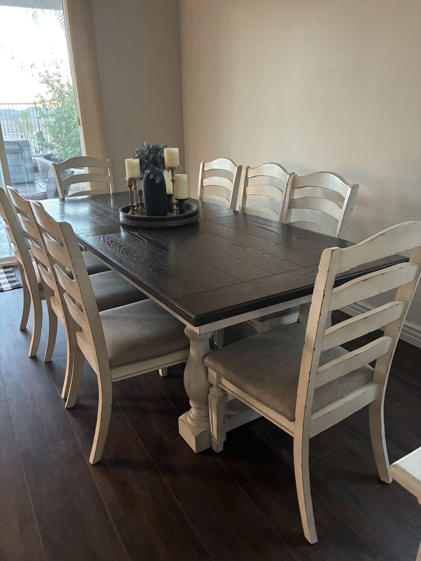 Beautiful dining table, extends for larger gatherings, 8-10 guests. 8 chairs are included. Table: Ashley Chair Brand: Ashley Chair model: Realyn Color: Two-tone antique white, distressed wood Dining table measurements: With extension leaf: 110inches L x 40inches W x 30inches H Without extension leaf: 92inches L x 40inches W x 30inches H The leaf measures: 18inches L x 40inches W Originally paid over $2500
