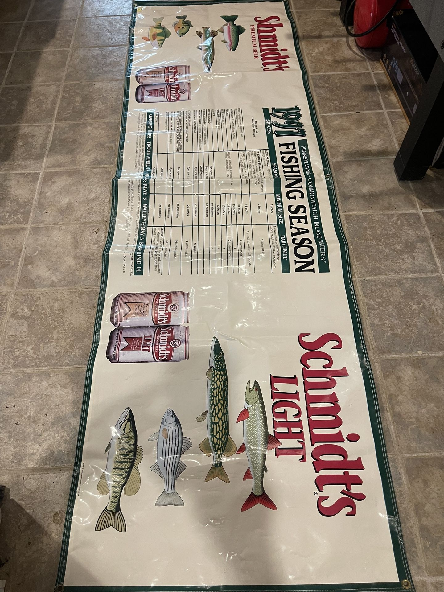 Schmidts Beer 1997 Fishing Banner 9’ 6” Long. Nice Collectible. You Must Pickup